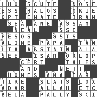 ACROSS 1. Nilotic language 4. Scutum 9. Olfactory organ 13. Double-curved letter 14. Rings 15. Migrant worker of the '30s 16. Elect 17. Related on the mother's side 18. SW Asia republic 19. Ocean 21. A saturated hydrocarbon 22. Indian state 24. Anneal 26. Compass dir. 27. Mexican monetary units 29. Fast planes 30. Place in a line 31. Dad 33. Scottish cap 36. 54 in ancient Rome 37. Refrain by choice 40. Chicken ___ king 41. Observe 42. Austrian river, tributary to the Danube 43. Lowest deck of a ship 45. Foregone conclusion 47. Lies 48. Also 49. Remaining after all deductions 50. Dwellings 52. Housemaid (var.) 54. Ewer handle 56. Become fatigued 57. Narrow boards 59. Brine-cured salmon 61. The sixth month of the Jewish calendar 62. Assad's deity 63. And so on (abbr.) 64. Actor Lugosi 65. Friendly 66. _-fi DOWN 1. Lion 2. United States Postal Service (abbr.) 3. Clearly or manifestly demonstrative 4. A female animal or person 5. Lessep's creation 6. ____ Bator, Mongolia 7. Carryall 8. Compass dir. 9. Annoying sounds 10. Gumbo ingredient 11. Thailand, formerly 12. Car or cant ending 20. Age 22. Slender Brazilian palm 23. Fast jet (abbr.) 25. At sea 27. Friends 28. Writer Wiesel 29. Coast Guard woman 31. Inconspicuous attention getter 32. _ moment's notice (2 wds.) 33. Baron Munchausen's specialties 34. Medicinal plant 35. Atlas contents 38. Avian creatures 39. Brief written record 44. Pace 45. Device for capturing images 46. Compass dir. 49. Relating to or accompanying birth 50. Flintstone garb 51. Spoken 52. Silent film actress Nazimova 53. Shopping center 55. College mil. group 56. Keyboard key 57. Plant excrement 58. Like a shrinking violet 60. One more than ninety