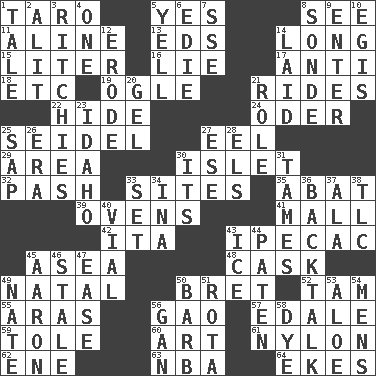 ACROSS 1. Pacific island yam 5. Consenting reply 8. Observe 11. Place in a line 13. Begley and Asner 14. Yearn 15. 61 cubic inches 16. Falsehood 17. Opposed to 18. And so on (abbr.) 19. Stare at amorously 21. Amusement-park features 22. Flintstone garb 24. River in Europe 25. A glass for beer 27. Snakelike fish 29. Length times width 30. Small island 32. Romantic infatuation 33. Locates 35. Blind as ____ 39. Baking chambers 41. Promenade 42. Call ___ day 43. Medicinal drug used to evoke vomiting 45. At sea 48. Keg 49. Brizilian seaport 50. Cy Young winner Saberhagen 52. Scottish cap 55. Ancient river in northeast Turkey 56. E Mali city 57. Peak District village in England 59. Lacquered or enameled metalware 60. Tate display 61. High-strength synthetic material 62. Compass dir. 63. Basketball assoc. 64. Supplements with great effort DOWN 1. Falsehood 2. Came down and settled, as after flight 3. Actors Guy, Robert Welles, and Clint 4. Single 5. Shout 6. Singer Brickell 7. Compass dir. 8. Something which is sent 9. Keyboard key 10. The front part of a cuirass 12. Wear away 14. Put down 20. Set 21. Hero or heavy, e.g. 23. Potato state 25. Plant excrement 26. Epoch 27. Compass dir. 28. Raised railways 30. ___ a Wonderful Life 31. Corrects by punishment or discipline 33. Arrange properly for use 34. _ tizzy (2 wds.) 36. Sass 37. In the manner of 38. Affectionate concern, for short 40. Small bottle 43. Frozen water 44. Eucharist need 45. Composer Copland 46. Lacking originality or spontaneity 47. Relaxation 49. Nathan's nickname 50. Sharp remark 51. Roll call or roster of names 53. _ vera 54. Not women's 56. Separate the seeds from cotton 58. Color