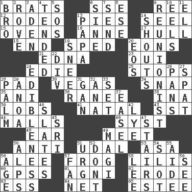 ACROSS 1. Naughty children 6. Compass dir. 9. To riddle 12. Cowboy competition 13. Sliced desserts 14. Stitch closed the eyes of (a falcon) 15. Baking chambers 16. Queen of England 1702-14 17. Frame or body of a ship 18. Conclude 19. Broke a traffic law 20. Immeasurably long periods of time 21. Pulitzer Prize-winning author Ferber 23. Fr. "Yes" 24. Singer Brickell 25. Closes up, plugs up 28. Groovy apt. 30. Viva Las _ 34. Fastener 35. Cuckoo 36. The wife of a rajah (variant) 38. _ tizzy (2 wds.) 39. Tennis shots 41. Relating to or accompanying birth 43. Fast jet (abbr.) 44. Shopping centers 46. System (abbr.) 48. Ewer handle 49. Rendezvous 50. Opposed to 51. Freehold land 53. White ___ sheet 56. Toward shelter 57. Toadlike animal 58. Ms. Damita and namesakes 60. Global Positioning Systems (abbr.) 61. Hindu god of fire 62. Eat (away) 63. Double-curved letter 64. Fish or hair follower 65. First name in cosmetics DOWN 1. Sis' sibling 2. Be footloose 3. Arabian gulf 4. Watched over 5. Distress signal 6. Trig term 7. Transmit 8. Compass dir. 9. One who advocates reunion 10. Snakelike fish 11. Pipe bend 13. Dad 14. Yells 19. Scornful expression 20. Greek goddess of the dawn 22. HTML Container Element 24. The property of being fit to eat 26. Zero-star reviews 27. Argument over a trivial matter 28. Inside of hand 29. Small Philippine buffalo 31. Separate the seeds from cotton 32. Santa ___, CA 33. Arrange properly for use 37. Artist's stand 40. Chalkboards 42. Potassium hydroxide 45. Indian title of respect (Mr.) 47. Flight of steps 49. Wise men 50. High mountains 51. Goad 52. Do not 54. Narrow, elongated depression 55. Helper 56. Grow older 57. Air blower 58. Area sheltered from the wind 59. Observe