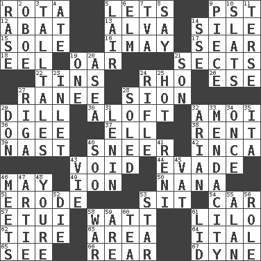ACROSS 1. Roll call or roster of names 5. Allows 9. Pacific Standard Time (abbr.) 12. Blind as ____ 13. Inventor's middle name 14. Filth; sediment 15. Flatfish 16. "If ____ say so..." 17. Burn superficially 18. Snakelike fish 19. Rowing implement 21. Religious groups 22. Metal containers 24. 17th letter of the Greek alphabet 26. Compass dir. 27. Indian princess (variant) 28. The Jewish people; Israel 29. Deli pickle 30. Upward 32. Mine, in Marseilles 36. Double curve, resembling the letter S 37. Pipe bend 38. Monthly bill 39. Political cartoonist Thomas 40. Contemptuous expression 42. South American Indian 43. Null 44. Elude 46. Can I? 49. Electrically charged atom 50. Nanny 51. Wear away 53. Be seated 54. 4-wheeled motor vehicle 57. Needle case 58. Electrical Unit 61. _ and Stitch 62. Become fatigued 63. Type of rug 64. Slanted text style (abbr.) 65. Perceive with the eye 66. Bring up, as a child 67. Unit of force DOWN 1. Raze (variant) 2. Mitch Miller's instrument 3. Baron Munchausen's specialties 4. Had dinner 5. Den 6. Shade tree 7. Federal power corp. 8. Declare 9. Part 10. Narrow boards 11. Laconic 14. Compass dir. 19. Single 20. At sea 21. Male offspring 23. An arm off of a larger body of water 24. Firearm 25. Being at a high temperature 27. Capital of Latvia 28. Having a sole or soles 29. Spanish title 31. Soviet premier 1918-24 32. Believer in; advocate of (suffix) 33. Ananias' fault 34. At one time in the past 35. Call ___ day 40. "Barney Miller" actor Jack 41. Painter Guido (1575-1642) 43. Compete 45. Large container 46. Confronts 47. Nick name for Arthur 48. You are 52. Pass on 53. Play the lead 55. ____ Jay Lerner 56. Hero or heavy, e.g. 58. Armed conflict 59. "We ___ not amused" (Victoria) 60. Afternoon social gathering 61. Flaplike covering