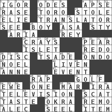 ACROSS 1. Composer Stravinsky 5. Lyric poems 9. Domed church section 13. Raze (variant) 14. "Corrida" creature 15. Fur scarf 16. Writer Wiesel 17. Interpreter 19. Observe 20. Male child 21. White ___ sheet 22. Filthy place 23. Operatic vocal solo 25. Marina Del _, California 26. Trading vessels 30. Lightbulb-shaped fruit 34. Small island 35. Do over again 36. Flat circle 39. Sadhe (variant) 42. Southwest Nigerian state 43. Christmas carol 44. Make or become more lively 46. Singer Murray 47. Happening 48. Hit sharply and swiftly 51. Eighteen holes 54. She-sheep 57. Single 58. Third mo. 60. Retirement account (abbr.) 62. Household entertainment appliance 65. Leave at once 66. Clothes sense 67. Gumbo ingredient 68. San ____ (Riviera town) 69. Actor Baldwin 70. Stitch closed the eyes of (a falcon) 71. A distinct part DOWN 1. Angers 2. An organ shaped like a helmet 3. Flexible twig of a willow tree 4. To sift 5. Von Bismarck 6. Small, narrow, flatbottom fishing boat 7. Period 8. Echolocation 9. "One Day ___ Time" 10. Plant holders 11. Slit 12. Suggestive of the supernatural 15. Kill 18. Compass dir. 20. Soap units 24. Tapering mass of hanging ice 27. Keyboard modifier key 28. Affirmative reply 29. Having lost freshness 30. Right away 31. Car or cant ending 32. Say or write further 33. Friend of Pooh 36. Heredity factor (abbr.) 37. Electrically charged atom 38. Elected rep. 40. HTML Container Element 41. First lady 45. Engineer (abbr.) 48. Be footloose 49. Black tropical American cuckoo 50. Mexican monetary units 52. It is permitted: Lat. 53. Movie unit 54. Singer James 55. Welt 56. Otherwise 58. Greater amount 59. Of or related to the anus 61. Tiny particle 63. And so on (abbr.) 64. Mamie's husband 65. _ Lanka