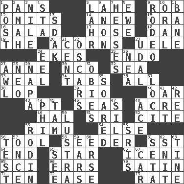 ACROSS 1. Baking dishes 5. Unable to walk 9. Director Reiner 12. Leaves out 14. Afresh 15. Mouth or opening 16. First course 17. Stockings 18. One of the 12 tribes of Israel 19. Definite Article 20. Oak nuts 23. Ubangi River tributary 24. Supplements with great effort 25. Inside; within (prefix) 27. Queen of England 1702-14 30. Non-commissioned officer (abbr.) 32. Ocean 33. Welt 34. Bar bills 36. 100% 38. Chop off 39. _ de Janeiro 40. Rowing implement 43. Fitting 46. Oceans 48. Measure of real estate 49. Actor Linden 51. _ Lanka 52. Quote 53. Tall New Zealand timber tree 54. Otherwise 56. Instrument 58. Sowing specialist 61. Fast jet (abbr.) 64. Conclusion 65. Play the lead 66. Ancient Celtic tribe of eastern Britain 68. _-fi 69. Blunders 70. Smooth fabric 71. "___ Little Indians" 72. Comfort 73. Assign a rank or rating to DOWN 1. Mail 2. Housemaid 3. "Death on the ____" 4. R.R. building 5. Cowardly lion portrayer 6. Soon (poet.) 7. Makes clutter 8. She-sheep 9. Cowboy competition 10. Spoken 11. Object of repulsion 13. Neighbor of Neb. 21. Penny 22. Motion picture awards 23. Hereditary estate 24. Snakelike fish 26. Teachers' org. 27. Leather borer 28. Modern: prefix 29. California wine valley 31. Off-Broadway awards 35. Flew 37. Venues 41. Nonscientific branch of learning 42. To riddle 44. Silvers or Donahue 45. Scottish cap 47. Drop; flow; fall 48. Adept person 50. A period of five years 53. "The Thinker" sculptor 55. Indian titles of respect 56. Trial 57. Single time 59. Hearing organs 60. Celtic language 61. Stalk of a moss capsule 62. In a ____ (agitated or irritated) 63. Prong on a fork 65. Perceive with the eye 67. 4-wheeled motor vehicle