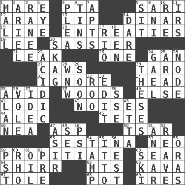 ACROSS 1. Female horse 5. Parent Teacher Association (abbr.) 8. Indian skirt 12. Like ___ of sunshine 13. Mouth edge 14. Middle Eastern gold or silver currency 15. Actor's bit 16. Pleas 19. Area sheltered from the wind 20. More disrespectful 21. Path through which fluid escapes 23. Single 24. Separate the seeds from cotton 27. Crow sounds 30. Edible starchy tuberous root 31. Disregard 34. Froth on beer 35. Enthusiastic 38. Forest 40. Otherwise 41. Farming town in central California 42. Annoying sounds 44. Actor Baldwin 45. Wig 46. Teachers' org. 47. Cleo's killer 50. Russian ruler of old 53. French poetic form 57. Modern: prefix 59. Conciliate 63. Singe 64. Bake eggs in their shells 65. Mountains (abbr.) 66. Polynesian shrub of the pepper family 67. Lacquered or enameled metalware 68. Plant holder 69. Angers DOWN 1. Shopping center 2. Satellite of Uranus 3. The wife of a rajah (variant) 4. Sight organ 5. Entreaty 6. Metal containers 7. Tenement units (abbr.) 8. Be seated 9. Black tropical American cuckoo 10. Actress Charlotte 11. Big collection agency 14. Have the gumption 17. River (Sp.) 18. Car or cant ending 20. Heroin 22. Being or containing an acid 24. Highlander 25. Ancient river in northeast Turkey 26. Connecting point 28. Compass dir. 29. Within a short period 30. College papers 32. Friend of Pooh 33. Prepare for publication 35. Actor Alda or Thicke 36. Grand slam 37. It may be bright or harebrained 39. Compass dir. 43. Singer James 47. SW Saudi Arabia district 48. Put into a specified state 49. 23rd letter of the Greek alphabet 51. Approach 52. Rob, plunder, or pillage 54. Pack (down) 55. "Tell ____ the Marines!" 56. A home for chicks 58. Mouths or openings 59. Pacific Standard Time (abbr.) 60. 17th letter of the Greek alphabet 61. Lubricate 62. Before (prefix) 63. What Jean-Claude Killy likes to do