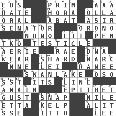 ACROSS 1. Begley and Asner 4. Demure 8. American Automobile Association (abbr.) 11. Pace 13. Israeli folk dance 14. Rounded earthenware pot or jar 15. Relating to the mouth 16. Blind as ____ 17. SW Saudi Arabia district 18. Legislator 21. U. of Maine site 22. Words to Nanette 23. Cards in a Roman deck? 25. Fenced enclosure 26. Ring climax 29. A testis 32. Nest on high 34. Actress Charlotte 35. Heredity factor (abbr.) 38. Put on (as clothing) 39. Pottery fragment 41. Drug cop 43. Compass dir. 44. Flowery wreath 45. Indian princess (variant) 46. Tchaikovsky ballet 50. Bear (Spanish) 51. Fast jet (abbr.) 54. It is 55. Actor's bit 57. With great haste 59. Curse 63. Abrupt rush of wind 64. Fastener 67. The longest river in the world 68. Singer James 69. Seaweed 70. Came down and settled, as after flight 71. Compass dir. 72. "Tell ____ the Marines!" 73. Area sheltered from the wind DOWN 1. Greek god of love 2. Have the gumption 3. Comedian Laurel of Laurel & Hardy 4. N Egypt peninsula 5. Director Reiner 6. Retirement account (abbr.) 7. Floor protector 8. Columnist Joseph or Stewart 9. Place in a line 10. Composer Copland 12. Style 14. Rowing implement 19. Haul 20. Single 21. Lubricate 23. One who doesn't tell the truth 24. On the rocks 26. The 23rd letter of the Hebrew alphabet 27. Peachy ____! 28. Northwest Algerian city 30. Hang back 31. Pulitzer Prize-winning author Ferber 33. Angers 36. Billionth: prefix 37. Ancient Greek god of war 39. Narrow board 40. Coop moms 42. Corporate head (abbr.) 45. Painter Guido (1575-1642) 47. Acquire through effort 48. City in Syria 49. Sleep 51. Gurus 52. Particles of soot 53. Clothes sense 56. Inactive volcano in Sicily 58. Call ___ day 60. Land elevation 61. Writer Wiesel 62. Wig 64. What Jean-Claude Killy likes to do 65. Fish or hair follower 66. Keyboard modifier key