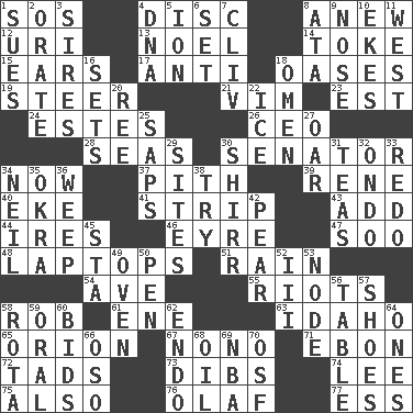 ACROSS 1. Mayday 4. Compact _ 8. Afresh 12. RI univ. 13. Christmas carol 14. Casino tip 15. Hearing organs 17. Against 18. Fertile tracts in a desert 19. Navigate 21. Zeal 23. Eastern Standard Time (abbr.) 24. _____ Park, CO 26. Corporate head (abbr.) 28. Oceans 30. Legislator 34. Immediately 37. Heart or essence 39. French philosopher Descartes 40. Make supply last 41. Empty completely 43. Find the sum of 44. Angers 46. Jane of fiction 47. "Barney Miller" actor Jack 48. Portable computers 51. Precipitation 54. "___ Maria" 55. Debaucheries 58. Director Reiner 61. Compass dir. 63. Potato state 65. Greek mythologigal hunter 67. Words to Nanette 71. Inky black, to poets 72. Bits 73. Rights 74. Area sheltered from the wind 75. In addition 76. Norwegian king 77. Curvy letter DOWN 1. Takes to court 2. Speak pompously 3. Fathers 4. Heredity factor (abbr.) 5. Electrically charged atom 6. Arrange properly for use 7. 154 in Roman numerals 8. _ moment's notice (2 wds.) 9. Sense of smell 10. Supplements with great effort 11. Compass direction 16. Puts into a specified state 18. Sign of something about to happen 20. Portuguese money of account (variant) 22. Frozen water 25. Plant excrements 27. Boat paddle 29. Settings 30. Bake eggs in their shells 31. Afternoon social gatherings 32. Southwest Nigerian state 33. Do over again 34. Famous astronaut Armstrong 35. Gumbo ingredient 36. Shed a tear 38. Attempt to accomplish something 42. Lightbulb-shaped fruit 45. R.R. building 49. Baking chamber 50. Writing instrument 52. One more than two 53. Connecting point 56. Eating place 57. Imelda's hoard 58. Round or rotation of duties 59. Of the mouth 60. Auction offers 62. Inside; within (prefix) 64. Singles 66. Bear (Spanish) 68. Petroleum 69. Basketball assoc. 70. Order of Saint Francis (abbr.)