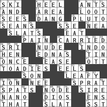 ACROSS 1. What Jean-Claude Killy likes to do 4. Person who is morally reprehensible 8. Pismires 12. Added to 13. Type of rug 14. Spoils 15. Observes 17. Mild oath, euphamism for damn 18. Mickey's pet 19. Actors Connery and Penn 21. Compass dir. 23. Teachers' org. 24. Narrow boards 26. Erode 28. Ache 30. Borne 34. _ Lanka 37. Naked 39. Southeast Asian peninsula 40. Layer 41. Ferber et al. 43. Shallow baking pan 44. At one time in the past 46. Relaxation 47. Baseball player Mel 48. Sycophants 51. Snakelike fish 54. Male offspring 55. Like summer trees 58. Electrically charged atom 61. Born 63. Small fatty European fish 65. Arguments over trivial matters 67. Connecting point 71. Male parent of an animal 72. Billionth: prefix 73. "Vaya con ____" 74. Followers of ems 75. Not this but _ 76. Narrow board 77. Fast jet (abbr.) DOWN 1. Backtalk 2. Leg joints 3. Perfect 4. Possessed 5. Period 6. Car or cant ending 7. Straggles 8. Everything 9. Part of speech 10. Lug 11. Portico 16. Fastener 18. Lightbulb-shaped fruit 20. R.R. building 22. Ocean 25. Trig term 27. Three (prefix) 29. Unclothed pictures 30. Desist 31. To the inside or interior of 32. Prepare for publication 33. Do not 34. Attempt 35. Former U.S. Attorney General Janet 36. South American Indian 38. Heredity factor (abbr.) 42. Stitch closed the eyes of (a falcon) 45. Begley and Asner 49. Charged atoms 50. Compass dir. 52. French article 53. Plant excrements 56. Strips of potato fried in deep fat 57. Tall tales 58. Is not 59. Brightly colored fish 60. Grandmother 62. Conclusions 64. Trial 66. Small child 68. Lubricate 69. ___ good deed 70. Eastern Standard Time (abbr.)