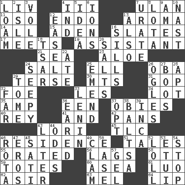 ACROSS 1. 54 in ancient Rome 4. One more than two 7. Uhlan (variant) 11. Bear (Spanish) 12. Inside; within (prefix) 13. Scent 14. Everything 15. An important port of Yemen 16. Chalkboards 17. Confronts 19. Helper 21. Ocean 23. _ vera 24. Table seasoning 25. Pipe bend 26. Chief or king in Benin or Nigeria 29. Laconic 30. Mountains (abbr.) 31. Grand Old Party 32. Enemy 33. French article 34. Car dealer's back yard 35. Electrical Unit 36. Car or cant ending 37. Off-Broadway awards 40. Marina Del _, California 41. Added to 42. Zero-star reviews 43. Australian parrot (variant) 45. Affectionate concern, for short 46. Home 51. Stories 55. Spoke pompously 56. Straggles 58. Baseball player Mel 59. Lugs 60. Toward the sea 61. Nilotic language 62. SW Saudi Arabia district 63. Cartoonist voice _ Blanc 64. Mouth edge DOWN 1. Rich soil 2. Capri or Wight 3. Short-tailed, large-bodied rat 4. Indiana (abbr.) 5. The main thing one is thinking about 6. Charged atoms 7. A salt of uric acid 8. Globular water bottle used in Asia 9. So be it 10. Political cartoonist Thomas 12. Artist's stands 13. In addition 16. Beverly of Met fame 18. Russian ruler of old 20. Table seasonings 22. Had dinner 24. Oozy 25. Make improvements or corrections to 26. Stares at amorously 27. Expressions of contempt or scorn 28. Fitting 29. Heavy book 32. At a great distance 33. Soviet premier 1918-24 36. Having ears or earlike features 37. Choose 38. Greek mezzo-soprano Agnes 39. South American Indian 43. 61 cubic inches 44. Lyric poems 46. Roll call or roster of names 47. Greek god of love 48. Suttee (variant) 49. Burrowing marine mollusk 50. Comfort 52. Hang loosely or laxly 53. Needle holder 54. Cease 57. Set