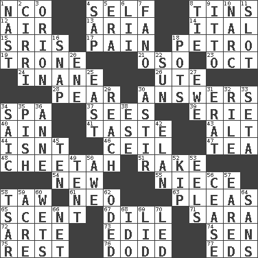 ACROSS 1. Non-commissioned officer (abbr.) 4. Automatic 8. Canisters 12. Wind 13. Operatic vocal solo 14. Slanted text style (abbr.) 15. Indian titles of respect 17. Ache 18. Stone: prefix 19. Heavy duty weighing machine 21. Bear (Spanish) 23. Sep. follower 24. Empty; void 26. Shoshoni 28. Lightbulb-shaped fruit 30. Responses 34. Health resort 37. Perceives with the eye 39. 4th largest of the Great Lakes 40. The 18th letter of the Arabic alphabet 41. Clothes sense 43. Keyboard modifier key 44. Is not 46. To provide with a ceiling 47. Beverage made from leaves 48. Leopard's kin 51. Immoral or dissolute person 54. ___ Haven, CT 55. Sibling's daughter 58. The 23rd letter of the Hebrew alphabet 61. Modern: prefix 63. Entreaties 65. Odor 67. Deli pickle 71. "Two Mules for Sister ____" 72. Johnson of "Laugh-In" 73. Singer Brickell 74. Elected rep. 75. Respite 76. Texas town _ City 77. Begley and Asner DOWN 1. Political cartoonist Thomas 2. High-altitude cloud 3. Constellation of myth 4. Plant excrement 5. Period 6. Cards in a Roman deck? 7. Papal veil 8. Standoff 9. "Tell ____ the Marines!" 10. Drug cop 11. Narrow opening 16. Fastener 18. Cooking vessels 20. Compass dir. 22. Player for Phoenix 25. 90 degrees 27. She-sheep 29. Arrive at 30. Being in motion 31. Part of Q.E.F. 32. Cause heat under the collar 33. Stalk of a moss capsule 34. Ketch in the Levant 35. Expression of disdain 36. Singer Murray 38. Compass dir. 42. Style 45. "___ Little Indians" 49. Portable shelter 50. Deep reverence 52. Monetary unit of Laos 53. Snakelike fish 56. Stop 57. Having ears or earlike features 58. Russian ruler of old 59. 43,560 square feet 60. Moistens 62. Wrote a lyric poem 64. Without 66. Fish or hair follower 68. Wedding promise 69. Hat (slang) 70. Directed
