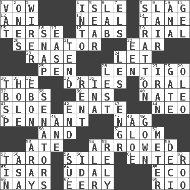 ACROSS 1. Solemn pledge 4. Capri or Wight 8. Volcanic refuse 12. Black tropical American cuckoo 13. Be tempered by heat 14. Not wild 15. Laconic 18. Bar bills 19. Monetary unit of Yemen 20. Elected representative 22. Ewer handle 23. To erase 24. Allow 25. Writing instrument 26. Small, flat, pigmented spot on the skin 30. Definite Article 33. Frees from moisture 36. Spoken 37. Moves up and down 39. Followers of ems 40. Nathan's nickname 41. _ gin 42. Related on the mother's side 44. Modern: prefix 45. Pre-World Series prize 47. Tired old horse 50. Added to 51. Take by theft 53. Had dinner 54. Moved like an arrow 57. Edible starchy tuberous root 59. Filth; sediment 61. Keyboard key 63. Austrian river, tributary to the Danube 64. Allodial 65. Environmental prefix 66. Negative votes 67. Suggestive of the supernatural 68. River (Sp.) DOWN 1. Large container 2. Washington bills 3. One who wires 4. To the inside or interior of 5. Singe 6. Experiment locale 7. Raised railways 8. Ski resort town in Vermont 9. Den 10. Nanny (var.) 11. Set 16. Fastener 17. Comfort 21. Look after 22. Car or cant ending 24. French article 26. For fear that 27. SW Asia republic 28. Yard entry 29. Margarine 30. Cook's measure (abbr.) 31. Hollow 32. Inky black, to poets 34. Monthly bill 35. _ tizzy (2 wds.) 38. Elected representatives 42. Conclusion 43. Engineer (abbr.) 46. A saturated hydrocarbon 48. _ vera 49. Woman's formal wear 52. Distance measurement 53. Like ___ of sunshine 54. Having or resembling wings 55. Have confidence or faith in 56. Tenth: prefix 57. Shallow baking pan 58. White ___ sheet 59. Institute legal proceedings 60. Binary compound 62. Friend of Pooh