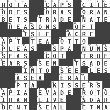 ACROSS 1. Round or rotation of duties 5. Balmoral and tarboosh 9. Quote 13. Lyric poems 14. Mouths or openings 15. NW Algerian seaport 16. Stakes 17. Barter 18. Nathan's nickname 19. Thinks logically 21. Often (poetically) 22. Capri or Wight 23. Measure of real estate 24. Fitting 27. Afternoon social gathering 28. "Beetle Bailey" pooch 29. Entreaties 31. Health resort 32. Religious women 36. Oceans 37. Small bed 38. Loyal 39. Hearing organs 40. Elected rep. 41. Sadhe (variant) 42. To the inside or interior of 44. Perceive with the eye 46. French article 47. Toward the sea 48. Part of Q.E.F. 50. Parent Teacher Association (abbr.) 51. Smoochers 54. Capital of Western Samoa 56. Dodge 58. Printing process, for short 60. SW Asia republic 61. Not recorded 62. Fly high 63. Gouge 64. Lick closed 65. Inactive volcano in Sicily DOWN 1. Director Reiner 2. Baltic tributary 3. False hair 4. Slender Brazilian palm 5. Pupil covering 6. Ancient river in northeast Turkey 7. Writing tablet 8. Compass dir. 9. Meets 10. Feeling or showing extreme anger 11. Make lace 12. Compass dir. 17. Lacquered or enameled metalware 20. Fast planes 21. Sep. follower 23. "One Day ___ Time" 24. Domed church section 25. Entreaty 26. Rend 28. Elect 30. Helper 31. Male offspring 33. Mountain range 34. Naked 35. Perceives with the eye 37. Corporate head (abbr.) 40. R.R. building 41. Beverages made from leaves 43. Teachers' org. 44. A glass for beer 45. Celtic language 47. Bee-related 49. Laconic 51. Polynesian shrub of the pepper family 52. Carrot, for example 53. Comedian Laurel of Laurel & Hardy 54. Help 55. Before (prefix) 56. Raised railways 57. Compete 59. Mouth or opening