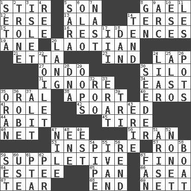 ACROSS 1. Move through with a circular motion 5. Male offspring 8. Highlander 12. Celtic language 13. Wing 14. Laconic 15. Lacquered or enameled metalware 16. Dwellings 19. One (Scot) 20. Of or relating to Laos or its people 21. Singer James 23. Indiana (abbr.) 24. Pet locale 27. Southwest Nigerian state 30. Grain storage tower 31. Fail to notice 34. 90 degrees 35. Taken by mouth 38. To the left, to Queeg 40. Greek god of love 41. Hero or heavy, e.g. 42. Flew 44. "This won't hurt ____!" 45. Hoop that covers a wheel 46. Fish or hair follower 47. Born 50. SW Asia republic 53. Stimulate to action 57. Director Reiner 59. Supplying deficiencies 63. Fine (Spanish) 64. First name in cosmetics 65. Baking dish 66. At sea 67. Pull apart 68. Conclusion 69. Remaining after all deductions DOWN 1. Stalk of a moss capsule 2. Heavy duty weighing machine 3. Small island 4. Portuguese money of account (variant) 5. "Two Mules for Sister ____" 6. Butter sub 7. Political cartoonist Thomas 8. Commissioned military rank (abbr.) 9. Curve 10. Compass dir. 11. French article 14. Be inclined (to) 17. One more than two 18. One of the 12 tribes of Israel 20. Austrian-born American filmmaker Fritz 22. Bathroom plumbing fixture 24. One who doesn't tell the truth 25. In addition 26. Plant holders 28. Heredity factor (abbr.) 29. I made a mistake 30. Sowing specialist 32. Friend of Pooh 33. Part of Q.E.F. 35. Northwest Algerian city 36. Loose flowing garment 37. Came down and settled, as after flight 39. Three (prefix) 43. One of the Great Lakes 47. Mediterranean tributary 48. Compass dir. 49. Eastern Standard Time (abbr.) 51. Get up 52. Music written for nine 54. Corncob 55. _ the terrible 56. Tear apart 58. Water vessel 59. Put into a specified state 60. Purpose 61. Parent Teacher Assoc. 62. For each 63. Air blower