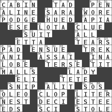 ACROSS 1. Small house or cottage 6. Bit 9. Animal enclosure 12. Place in a line 13. "Two Mules for Sister ____" 14. Had on 15. Plash 16. Took on color 17. Capital of Western Samoa 18. Compass dir. 19. Globular water bottle used in Asia 20. A slight indication 21. Set or collection 23. Everything 24. Singer James 25. Rends 28. Writing tablet 30. Follow as a consequence or result 34. Long journey 35. Cuckoo 36. Slender Brazilian palm 38. _ tizzy (2 wds.) 39. Ear part 41. Laconic 43. Teat (slang) 44. Promenades 46. Kenny Rogers chart-topper in '80 48. Connecticut Ivy Leaguer 49. False hair 50. Clip 51. Came down and settled, as after flight 53. Distress signal 56. Margarine 57. Hoof sound 58. 61 cubic inches 60. A home for chicks 61. Tenth: prefix 62. First name in cosmetics 63. Begley and Asner 64. _-fi 65. Took without asking DOWN 1. Head covering 2. Medicinal plant 3. Auction offers 4. Swallow 5. Born 6. Pulled tight 7. Length times width 8. June honoree 9. Teen's desire 10. One of the Great Lakes 11. Teachers' org. 13. Opportunity 14. Place for singles 19. Climbing, woody, usually tropical vines 20. Domesticated feline 22. Shoshoni 24. The property of being fit to eat 26. Painter Guido (1575-1642) 27. Three-handed card game 28. Inside of hand 29. Small Philippine buffalo 31. Fast jet (abbr.) 32. Purpose 33. Ewer handle 37. Small island 40. American author Paul (1891-1958) 42. Consume 45. Small drink 47. Stop 49. Native american tent (variation) 50. Downhill vehicle 51. Actor Baldwin 52. Locales 54. "Beetle Bailey" pooch 55. Stitch closed the eyes of (a falcon) 56. Single 57. Music discs 58. French article 59. To riddle