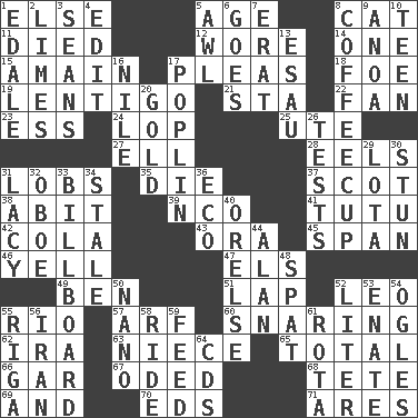 ACROSS 1. Otherwise 5. Mature 8. Feline 11. Passed on 12. Had on 14. Single 15. With great haste 17. Entreaties 18. Enemy 19. Small, flat, pigmented spot on the skin 21. R.R. building 22. Avid follower 23. Curvy letter 24. Chop off 25. Shoshoni 27. Pipe bend 28. Snakelike fish 31. Tennis shots 35. Pass on 37. Highlander 38. "This won't hurt ____!" 39. Non-commissioned officer (abbr.) 41. Ballerina skirt 42. Root beer relative 43. Mouth or opening 45. Connect, as a bridge 46. Shout 47. Raised railways 49. Benjamin's nick name 51. Pet locale 52. Lion 55. _ de Janeiro 57. Sandy's bark 60. Catching in a trap 62. Lyricist Gershwin 63. Sibling's daughter 65. "_____ Recall" 66. Slender fish 67. Wrote a lyric poem 68. False hair 69. Added to 70. Begley and Asner 71. Ancient Greek god of war DOWN 1. Peak District village in England 2. Citrus fruits 3. Seines 4. Prepare for publication 5. Leather borer 6. Moves 7. Part of Q.E.F. 8. Java holder (2 wds.) 9. Small Philippine buffalo 10. Adolescent 13. He sold his birthright 16. The longest river in the world 17. Cotton for raincoats, e.g. 20. Aureate 26. Trials 29. Globular water bottle used in Asia 30. Astound 31. Made of lace 32. Mitch Miller's instrument 33. Big road sign 34. Having lost freshness 36. Environmental prefix 40. Threatening words 44. ____ Jay Lerner 48. Argument over a trivial matter 50. Billionth: prefix 52. 61 cubic inches 53. Maternal 54. Stares 55. Port city in Latvia 56. SW Asia republic 58. Travel on an animal 59. Nourish 61. Round or rotation of duties 64. Music discs