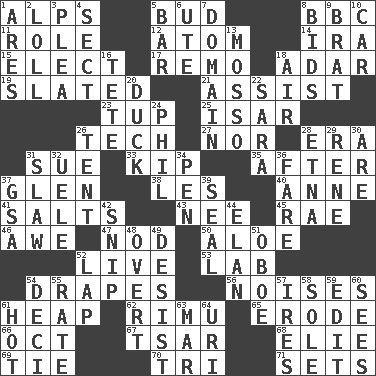 ACROSS 1. High mountains 5. Partially opened flower 8. English channel? 11. Hero or heavy, e.g. 12. Smallest unit of an element 14. Retirement account (abbr.) 15. Choose 17. San ____ (Riviera town) 18. The sixth month of the Jewish calendar 19. Scheduled 21. Aid 23. Uncastrated adult male sheep 25. Austrian river, tributary to the Danube 26. Technician 27. Or not 28. Period 31. Take to court 33. Sleep 35. Following 37. Small, secluded valley 38. French article 40. Queen of England 1702-14 41. Table seasonings 43. Born 45. Actress Charlotte 46. Deep reverence 47. Lower and raise head in agreement 50. _ vera 52. Not recorded 53. Experiment locale 54. Window treatments 56. Annoying sounds 61. Pile 62. Tall New Zealand timber tree 65. Wear away 66. Sep. follower 67. Russian ruler of old 68. Writer Wiesel 69. Make a knot 70. Three (prefix) 71. Puts into a specified state DOWN 1. Ancient Greek god of war 2. Hang loosely or laxly 3. Entreaty 4. Religious group 5. Tavern 6. Shoshoni 7. Realm 8. Auction offers 9. Naughty child 10. Automobile 13. With motion or animation 16. Wig 18. Wind 20. Evade 22. "Two Mules for Sister ____" 24. Silvers or Donahue 26. Portable shelter 28. Inactive volcano in Sicily 29. French philosopher Descartes 30. "We ___ not amused" (Victoria) 31. Cole _ (cabbage dish) 32. Ubangi River tributary 34. Animal enclosure 36. Conductor's collection 37. Girls' org. (abbr.) 39. Lick closed 42. Clip 44. Liveliness 48. Unconcealed 49. Cease 51. Mitch Miller's instrument 52. Pet locale 54. Tenth: prefix 55. Pace 57. Angers 58. Not divided or shared with others 59. Prepare for publication 60. Perceives with the eye 61. Being at a high temperature 63. Spoil 64. RI univ.