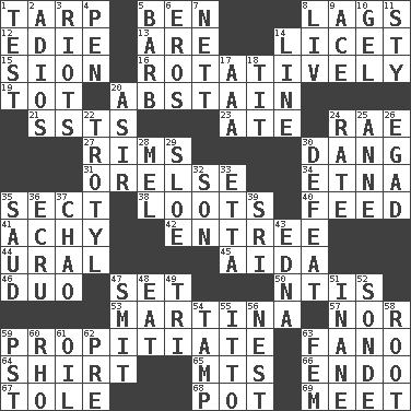 ACROSS 1. Canvas cover 5. Benjamin's nick name 8. Falls behind 12. Singer Brickell 13. "We ___ not amused" (Victoria) 14. It is permitted: Lat. 15. The Jewish people; Israel 16. Producing rotation 19. Small child 20. Refrain by choice 21. Fast planes 23. Had dinner 24. Actress Charlotte 27. Basketball hoops 30. Mild oath, euphamism for damn 31. Threatening words 34. Inactive volcano in Sicily 35. Religious group 38. Plunders 40. Nourish 41. Painful 42. Main course 44. Mountain range 45. Opera by Verdi 46. Superhero pair 47. Put into a specified state 50. Nuclear Threat Initiatives 53. Chrissie's court nemesis 57. And not 59. Conciliate 63. Papal veil 64. Chest covering 65. Mountains (abbr.) 66. Inside; within (prefix) 67. Lacquered or enameled metalware 68. Plant holder 69. Rendezvous DOWN 1. Trial 2. Goodbye (Sp.) 3. Debaucheries 4. Fenced enclosure 5. Sharp remark 6. Greek god of love 7. Remaining after all deductions 8. 54 in ancient Rome 9. Adept person 10. Set 11. Filthy place 14. Actor's bit 17. American Automobile Association (abbr.) 18. Teat (slang) 20. SW Saudi Arabia district 22. TNT 24. Pace 25. Singer Murray 26. Mild oath 28. Cartoonist voice _ Blanc 29. A type of plum 30. Outscore 32. Male offspring 33. Singer James 35. Saudi Arabian king (1953-1964) 36. Shade of tan 37. US Secretary of Labor Elaine L. _ 39. Indian title of respect (Mr.) 43. Pulitzer Prize-winning author Ferber 47. Stricken, poetically 48. Erode 49. Three (prefix) 51. Silly 52. Something which is sent 54. Pack (down) 55. "Tell ____ the Marines!" 56. Egg locale 58. Carrot, for example 59. Pacific Standard Time (abbr.) 60. 17th letter of the Greek alphabet 61. Petroleum 62. Before (prefix) 63. Opposite of masc.