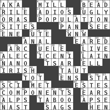 ACROSS 1. Alias (abbr.) 4. Place where flour is made 8. Necklace unit 12. Cause heat under the collar 14. Goodbye (Sp.) 16. Repulsive 17. Mouths or openings 18. Census information 20. Settings 22. Baking dish 23. Perceive with the eye 24. Compass dir. 25. Shoshoni 28. Compass dir. 30. Of or related to the anus 31. Having ears or earlike features 35. Curve 37. Ubangi River tributary 40. Moving, as bait 41. Actor Baldwin 42. Ancient Celtic tribe of eastern Britain 44. (Had) reclined 45. Billionth: prefix 46. Russian ruler of old 47. Pipe bend 48. From or relating to Ireland 50. Drawn tight 52. Small child 54. Followers of ems 55. R.R. building 58. _-fi 61. Was introduced to 63. _____ Park, CO 65. Parts 70. Hearing organs 71. High mountains 72. Off limits 73. Domed church section 74. Political cartoonist Thomas 75. Settles 76. Layer DOWN 1. Came up 2. Japanese brewing company 3. Having winglike extensions 4. Atlas unit 5. Wedding promise 6. Mouth edge 7. Central Nebraska county 8. Yet 9. The front part of a cuirass 10. Medicinal plant 11. Centimeter-gram-second unit of force 13. Compass dir. 15. Cole _ (cabbage dish) 19. Queen of England 1702-14 21. Player for Phoenix 26. "Change" in Tahitian 27. Opt 29. Place for singles 30. Buttonhole 32. Monetary unit of Yemen 33. Tending to cause great harm 34. Lair 35. Having or resembling wings 36. Painter Guido (1575-1642) 38. French article 39. Maternal 41. Black tropical American cuckoo 43. SW Asia republic 49. Like (prefix) 51. Purpose 53. Portable shelter 55. Staphylococcus 56. Laconic 57. NE Netherlands city 58. Examine minutely or intensely 59. Root beer relative 60. Naughty children 62. Afternoon social gatherings 64. Ocean 66. Pacific Standard Time (abbr.) 67. Basketball assoc. 68. Coat; cloak 69. Distress signal
