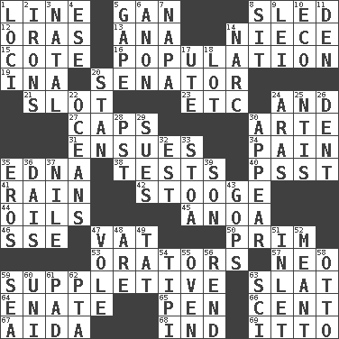 ACROSS 1. Actor's bit 5. Separate the seeds from cotton 8. Downhill vehicle 12. Mouths or openings 13. Santa ___, CA 14. Sibling's daughter 15. ____ d'Azur (French Riviera) 16. Census information 19. _ tizzy (2 wds.) 20. Elected representative 21. Slit 23. And so on (abbr.) 24. Also 27. Smile enhancers 30. Johnson of "Laugh-In" 31. Follows as a consequence or result 34. Ache 35. Pulitzer Prize-winning author Ferber 38. Trials 40. Inconspicuous attention getter 41. Water falling in drops from the sky 42. Moe Howard, for one 44. Lubricates 45. Small Philippine buffalo 46. Compass dir. 47. Large container 50. Demure 53. Speakers 57. Modern: prefix 59. Supplementary 63. Narrow board 64. Maternal 65. Animal enclosure 66. Penny 67. Opera by Verdi 68. Working for oneself (abbr.) 69. "Tell ____ the Marines!" DOWN 1. Locales 2. Removes the wrinkles 3. Relating to or accompanying birth 4. Compass dir. 5. Open wide 6. At once, immediately (arch.) 7. California wine valley 8. Be seated 9. Flowery wreath 10. Environmental prefix 11. Lair 14. Drug cop 17. Shoshoni 18. Car dealer's back yard 20. Comedian Laurel of Laurel & Hardy 22. Seas 24. Caspian sea tributary 25. Nuclear Threat Initiatives 26. Scratch 28. Pacific Standard Time (abbr.) 29. Institutes legal proceedings 30. Become visible 32. Eastern Standard Time (abbr.) 33. Portico 35. Greek god of love 36. Raised platform 37. Mediterranean tributary 39. Manchild 43. Republicans 47. Short-tailed, large-bodied rat 48. "We ___ not amused" (Victoria) 49. Make lace 51. An arm off of a larger body of water 52. Intended 54. Native american tent (variation) 55. Baking chamber 56. Tear apart 58. Von Bismarck 59. Ocean 60. Corn or form start 61. Writing tablet 62. Parent Teacher Assoc. 63. _-fi