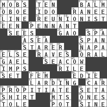 ACROSS 1. Crowds into 5. Nine, plus one 8. Lip ointment 12. Mitch Miller's instrument 13. Wedding promise 14. The wife of a rajah (variant) 15. Actor's bit 16. One who advocates reunion 19. Car or cant ending 20. Pre-World Series prize 21. Perceives with the eye 23. E Mali city 24. Health resort 27. Toward the sea 30. Connect, as a bridge 31. A viewer who gazes fixedly 34. California wine valley 35. Otherwise 38. All-night dance parties 40. Spoken 41. Highlander 42. Manatee 44. Naughty children 45. Cause heat under the collar 46. Put into a specified state 47. Opposite of masc. 50. Singer Brickell 53. Preparing or cooking with lard 57. 4-wheeled motor vehicle 59. Appease 63. Bristle 64. Chest covering 65. Mountains (abbr.) 66. Singles 67. Lacquered or enameled metalware 68. Cooking vessel 69. Trig term DOWN 1. Undercover agent 2. Off-Broadway awards 3. Maid-servant 4. Observe 5. Hoop that covers a wheel 6. Locale of original sin 7. Part of speech 8. Forbid 9. Cuckoo 10. French article 11. Was introduced to 14. Printing process, for short 17. Tired old horse 18. _ tizzy (2 wds.) 20. Inconspicuous attention getter 22. Artist's stands 24. Practice fight 25. Dad 26. Of or related to the anus 28. Hearing organ 29. Ancient river in northeast Turkey 30. Frozen precipiation fell 32. Night before a holiday 33. Bring up, as a child 35. Armor plate that protects the chest 36. Unable to walk 37. Back-to-school mo. 39. _-fi 43. Cassini of fashion 47. Secret move to avoid paying debts 48. Erode 49. Medical imaging device (abbr.) 51. Ancient Celtic tribe of eastern Britain 52. Eroded 54. Moist 55. "Tell ____ the Marines!" 56. A home for chicks 58. To erase 59. Pacific Standard Time (abbr.) 60. 17th letter of the Greek alphabet 61. Petroleum 62. Before (prefix) 63. Distress signal