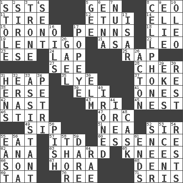ACROSS 1. Fast planes 5. Commissioned military rank (abbr.) 8. Corporate head (abbr.) 11. Become fatigued 12. Needle case 14. Pipe bend 15. U. of Maine site 17. Actor Sean's family 18. Falsehood 19. Small, flat, pigmented spot on the skin 21. White ___ sheet 22. Lion 23. Compass dir. 24. Infant locale 25. Reproach for some lapse or misdeed 27. Observe 28. "Mermaids" star 31. Pile 35. Potassium hydroxide 37. Puff or smoke 38. Celtic language 39. Biblical high priest 41. Washington bills 42. Political cartoonist Thomas 43. Medical imaging device (abbr.) 45. A home for chicks 46. Commotion 47. The grampus (Milton) 49. Small drink 51. Teachers' org. 52. Title for a knight 55. Consume 57. It would 60. Gist 62. Santa ___, CA 63. Pottery fragment 65. Leg joints 66. Male offspring 67. Israeli folk dance 68. Gouge 69. Make lace 70. To separate or throw off 71. Indian titles of respect DOWN 1. Took without asking 2. Begets 3. Marketplace scale 4. Emitted 5. Turn to the right 6. Inactive volcano in Sicily 7. Religious women 8. Portable communications device 9. Writer Wiesel 10. Margarine 13. Austrian river, tributary to the Danube 16. Petroleums 17. Wimpy's pal 20. Highlander 26. NE Massachussets city 29. Supplements with great effort 30. Respite 31. Coop moms 32. Part of Q.E.F. 33. Helper 34. _ dish (used to culture cells) 36. Shade tree 40. Pressed 44. Angers 48. Keg 50. Expression of disdain 52. Scornful expression 53. Ancient Celtic tribe of eastern Britain 54. Musical pauses 55. 90 degrees 56. Small Philippine buffalo 58. Son of Odin 59. Have the gumption 61. Conclusions 64. Actress Charlotte
