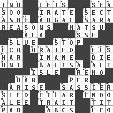 ACROSS 1. Working for oneself (abbr.) 4. Allows 8. Ocean 11. "Barney Miller" actor Jack 12. Feeling or showing extreme anger 14. Religious group 15. American tennis player Robert 17. Therefore, facetiously 18. "Two Mules for Sister ____" 19. Thinks logically 21. Taiwanese island in East China Sea 23. According to 24. Compass dir. 25. Change direction abruptly 27. Discontinue 30. Environmental prefix 31. Spoke pompously 34. Raised railways 37. Third mo. 38. Silly 39. Expire 40. University (slang) 41. Greek mezzo-soprano Agnes 43. The first octave above the treble staff 44. Small island 45. San ____ (Riviera town) 47. Drinking establishment 49. For each 50. Get up 52. More impudent 56. Downhill vehicle 57. Having threads 60. Inside; within (prefix) 61. Toward shelter 62. Distinguishing feature 63. Teat (slang) 64. Groovy apt. 65. Lettered men learn these first 66. Lion DOWN 1. Austrian river, tributary to the Danube 2. Sense of smell 3. Capital of the state of Qatar 4. Woody, climbing, usually tropical plant 5. Blunders 6. Label 7. R.R. building 8. Gospel singer Marvin 9. Shade of tan 10. "One Day ___ Time" 13. Shade tree 14. Fast planes 16. He sold his birthright 20. Butter sub 22. Cleo's killer 25. Skim 26. Australian parrot (variant) 27. Lacking originality or spontaneity 28. Portable shelter 29. Lyric poems 30. Australian flightless bird 32. Chest bones 33. Of or related to the anus 34. Dutch treat 35. _ and Stitch 36. Arrange properly for use 42. Ancient Greek god of war 44. Big collection agency 46. Celtic language 47. A special lineage 48. Assistant 49. Pieces 50. Silent film actress Nazimova 51. Bank Draft (abbr.) 52. Ketch in the Levant 53. International (abbr.) 54. Singer Brickell 55. Printing process, for short 56. Plant excrement 58. Lyricist Gershwin 59. Experiment locale