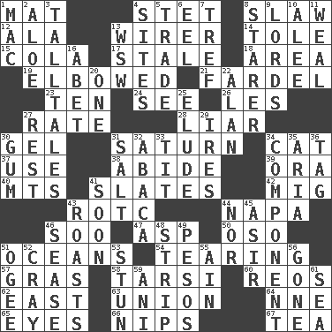 ACROSS 1. Floor protector 4. Proofreading order 8. Cole _ (cabbage dish) 12. Wing 13. One who wires 14. Lacquered or enameled metalware 15. Root beer relative 17. Showing deterioration from age 18. Length times width 19. Shoved, as through a crowd 21. Bundle 23. Nine, plus one 24. Perceive with the eye 26. French article 27. Assign a rank or rating to 28. One who doesn't tell the truth 30. Set 31. Titan orbits this 34. Feline 37. Purpose 38. Tolerate 39. Mouth or opening 40. Mountains (abbr.) 41. Chalkboards 42. Russian fighter aircraft 43. College mil. group 44. California wine valley 46. "Barney Miller" actor Jack 47. Viper 50. Bear (Spanish) 51. Seas 54. Separating forcefully 57. Pate de foie ____ 58. Tarsus (plural) 60. Vintage cars 62. Compass direction 63. The state of being joined or united 64. Compass dir. 65. Snake ____ (dice throw) 66. Pinches, bites 67. Afternoon social gathering DOWN 1. Apple computer (short form) 2. Medicinal plant 3. Baron Munchausen's specialties 4. Locates 5. Swap 6. Snakelike fish 7. Unclean, religiously 8. A viewer who gazes fixedly 9. Nobles 10. Toward shelter 11. Welt 13. Compass dir. 16. Collude with 20. Single 22. ____ Jay Lerner 25. Evade 27. State of inaction 29. Angers 30. Chewing product 31. Table seasoning 32. Phillipine bananalike plant 33. Teat (slang) 34. Part 35. Operatic vocal solo 36. Label 41. Within a short period 43. Ridicules or criticizes harshly 44. Not either 45. SW Saudi Arabia district 46. Gospel singer Marvin 48. Empty completely 49. Mexican monetary units 51. Double curve, resembling the letter S 52. Supercomputer manufacturer 53. Make senseless or dizzy 55. The 18th letter of the Arabic alphabet 56. Went 59. Cuckoo 61. Ocean