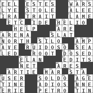 ACROSS 1. Snakelike fish 4. _____ Park, CO 9. Armed conflicts 13. Sodium hydroxide 14. Took without asking 15. Toward shelter 16. Lyricist Gershwin 17. Distinguishing feature 18. Unable to walk 19. And so on (abbr.) 21. Binary compound 22. Sun: prefix 24. Assist 26. "We ___ not amused" (Victoria) 27. Sports stadium 29. Narrow board 30. _ pole 31. Grain storage tower 33. Electrical Unit 36. "___ Maria" 37. Noisy, rowdy, vocal (Spanish) 40. Ocean 41. Directed 42. Carrot, for example 43. Administered medicine 45. Liveliness 47. Proofreads 48. Fish or hair follower 49. Ancient Greek god of war 50. Nick name for Arthur 52. Third mo. 54. R.R. building 56. One who makes use of a thing 57. Twentieth part of a lira 59. Mature 61. Prong on a fork 62. Goodbye (Sp.) 63. Compass dir. 64. 4th largest of the Great Lakes 65. Stone: prefix 66. Shallow baking pan DOWN 1. Connecticut Ivy Leaguer 2. Jane of fiction 3. Resembling or made to resemble leather 4. Eastern Standard Time (abbr.) 5. Long narrow piece of something 6. Frog relative 7. Writer Wiesel 8. Arrange properly for use 9. Place for singles 10. Jai ____ 11. San ____ (Riviera town) 12. Observe 20. Penny 22. Rings 23. Period 25. Cowardly lion portrayer 27. Of or related to the anus 28. Be footloose 29. Narrow opening 31. The Jewish people; Israel 32. Wedding promise 33. Helper 34. Rendezvous 35. Groovy apts. 38. A salt of uric acid 39. Baltic tributary 44. Lyric poems 45. Main course 46. Luau accessory 49. Zeal 50. SW Saudi Arabia district 51. Painter Guido (1575-1642) 52. Method 53. Came down and settled, as after flight 55. Hindu god of fire 56. Shoshoni 57. Plant excrement 58. Bear (Spanish) 60. Car or cant ending