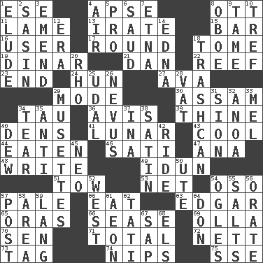 ACROSS 1. Compass dir. 4. Domed church section 8. Baseball player Mel 11. Unable to walk 13. Feeling or showing extreme anger 15. Drinking establishment 16. One who uses or employs something 17. Single shot of ammunition 18. Heavy book 19. Middle Eastern gold or silver currency 21. Daniel's nick name 22. Coral collection 23. Conclusion 24. Attila the _ 27. Actress Gardner 29. Method 30. Indian state 34. The 19th letter of the Greek alphabet 36. Advice 39. One or ones belonging to thee 40. Habitations of wild animals 41. Type of eclipse 43. Calm and collected 44. Eroded 46. Suttee (variant) 47. Santa ___, CA 48. Compose 49. Goddess of spring and wife of Bragi 51. Pull behind 53. Fish or hair follower 54. Bear (Spanish) 57. Diluted with white 60. Erode 63. _ Allan Poe 65. Mouths or openings 66. Gospel singer Marvin 69. Rounded earthenware pot or jar 70. Elected rep. 71. "_____ Recall" 72. Remaining after all deductions 73. Label 74. Pinches, bites 75. Compass dir. DOWN 1. Evade 2. Indian antelope 3. Make improvements or corrections to 4. Wind 5. Adept person 6. Saudi Arabian king (1953-1964) 7. Inactive volcano in Sicily 8. Mitch Miller's instrument 9. Not wild 10. Unclean, religiously 12. Period 14. Pulitzer Prize-winning author Ferber 18. File 13 20. 17th letter of the Greek alphabet 25. Allodial 26. Congenital growth or mark on the skin 28. Large container 29. French bagpipes 31. The Jewish people; Israel 32. Small Philippine buffalo 33. Cartoonist voice _ Blanc 34. Pull apart 35. Against 37. _ tizzy (2 wds.) 38. Smooth fabric 40. Morning condensation 42. Travel on or in a vehicle 45. Modern: prefix 50. Shoshoni 52. 270 degrees 54. Stares at amorously 55. Table seasonings 56. Declaim 57. Mail 58. Length times width 59. Austrian-born American filmmaker Fritz 61. A really long time 62. Jacques of French films 64. Spanish title 67. Plant excrement 68. Raised railways