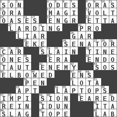ACROSS 1. Male offspring 4. Lyric poems 8. Mouths or openings 12. Mouth or opening 13. Wise men 14. Electrical Unit 15. Fertile tracts in a desert 18. Engineer (abbr.) 19. Singer James 20. Preparing or cooking with lard 22. Adept person 23. One who doesn't tell the truth 24. Slender fish 25. Make supply last 26. Legislator 30. 4-wheeled motor vehicle 33. Killed 36. Prong on a fork 37. Singles 39. Epoch 40. Inside; within (prefix) 41. Pulled tight 42. Foe 44. Mayday 45. Turned at an angle; bent 47. Followers of ems 50. Writing instrument 51. Globular water bottle used in Asia 53. Fitting 54. Portable computers 57. Body of Kaffir warriors 59. The Jewish people; Israel 61. Having ears or earlike features 63. It's straight from the horse's mouth 64. Goddess of spring and wife of Bragi 65. Call ___ day 66. Volcanic refuse 67. Drink excessively 68. Experiment locale DOWN 1. "Barney Miller" actor Jack 2. Spoken 3. Rhinal 4. Sign of things to come 5. Mild oath, euphamism for damn 6. Oval reproductive body of a fowl 7. Title for a knight 8. Make much ado about nothing 9. Printing process, for short 10. Keyboard modifier key 11. R.R. building 16. One of the Great Lakes 17. Neighbor of Neb. 21. Angers 22. Baking dish 24. Commissioned mil. rank 26. Thailand, formerly 27. Canisters 28. Southwest Nigerian state 29. Vintage cars 30. ____ d'Azur (French Riviera) 31. Of or related to the anus 32. Reuben's nickname 34. Grant temporary use of 35. "We ___ not amused" (Victoria) 38. Constricting 42. Car or cant ending 43. Sharp bark 46. Dripping 48. Make mention of 49. Portico 52. Showery time 53. Capital of Western Samoa 54. Central Nebraska county 55. Singer Murray 56. Stalk of a moss capsule 57. Big collection agency 58. Cartoonist voice _ Blanc 59. Be seated 60. Wedding promise 62. Apply (a substance) by light strokes