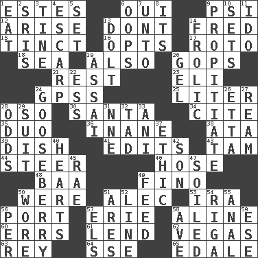ACROSS 1. _____ Park, CO 6. Fr. "Yes" 9. Air pressure measure (abbr.) 12. Ascend 13. Do not 14. Flintstone 15. A color or tint 16. Chooses 17. Printing process, for short 18. Ocean 19. In addition 20. Republicans 21. Take ten 23. Connecticut Ivy Leaguer 24. Global Positioning Systems (abbr.) 25. 61 cubic inches 28. Bear (Spanish) 30. Before Barbara or Clara 34. Quote 35. Superhero pair 36. Silly 38. _ moment's notice (2 wds.) 39. Food container 41. Proofreads 43. Scottish cap 44. Bull 46. Flexible conduit 48. Sound made by sheep 49. A pale, very dry sherry 50. Past tense of be (plural) 51. Actor Baldwin 53. Retirement account (abbr.) 56. Sweet dark-red dessert wine 57. One of the Great Lakes 58. Place in a line 60. Blunders 61. Grant temporary use of 62. Viva Las _ 63. Marina Del _, California 64. Compass dir. 65. Peak District village in England DOWN 1. Ingest 2. Indian titles of respect 3. Prong on a fork 4. Fortification 5. Put into a specified state 6. I made a mistake 7. To (old English) 8. ___ a Wonderful Life 9. Appease 10. Puts into a specified state 11. Wedding promise 13. Stupid person 14. Romp 19. Slender Brazilian palm 20. Set 22. Curvy letter 24. Sour, prickly fruit 26. Singer James 27. 480, 500 or 516 sheets of paper 28. Probability 29. Costume for a special activity 31. Compass dir. 32. Small amount or degree 33. Black tropical American cuckoo 37. Value system 40. Centers of feelings and intuitions 42. Manchild 45. Actress Charlotte 47. Dirtied 49. Nourish 50. Had on 51. Ancient Greek god of war 52. Actor's bit 54. Capital of Latvia 55. Of or related to the anus 56. For each 57. Raised railways 58. "___ Maria" 59. Compass dir.