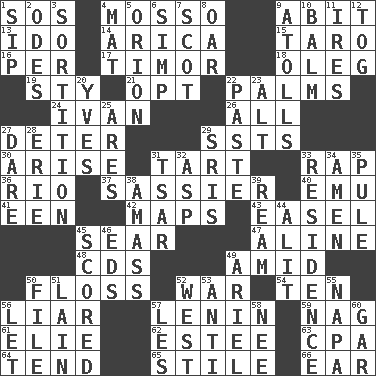 ACROSS 1. Mayday 4. With motion or animation 9. "This won't hurt ____!" 13. Wedding promise 14. N. Chile seaport 15. Pacific island yam 16. For each 17. Southeast Indonesia island 18. Cassini of fashion 19. Filthy place 21. Elect 22. Insides of hands 24. _ the terrible 26. 100% 27. Prevent from occurring 29. Fast planes 30. Ascend 31. Small pie 33. Strike 36. _ de Janeiro 37. More disrespectful 40. Australian flightless bird 41. Car or cant ending 42. Atlas contents 43. Artist's stand 45. Dry up 47. Place in a line 48. Music discs 49. Among 50. Soft thread for cleaning between teeth 52. Armed conflict 54. Nine, plus one 56. One who doesn't tell the truth 57. Soviet premier 1918-24 59. Tired old horse 61. Writer Wiesel 62. First name in cosmetics 63. Numbers guy (abbr.) 64. Look after 65. Vertical member of a panel or frame 66. Hearing organ DOWN 1. Small drink 2. Lyric poems 3. Decision 4. Floor protector 5. Greek mythologigal hunter 6. Simple or foolish person 7. Highlander 8. Rowing implement 9. Ringlike coral islands and reefs 10. Lip ointment 11. Angers 12. Coat; cloak 20. Jacques Cousteau's middle name 22. Thick mixture 23. Keyboard modifier key 25. Ancient Greek god of war 27. Have the gumption 28. 4th largest of the Great Lakes 29. Indian titles of respect 31. Russian ruler of old 32. Viper 33. Home 34. So be it 35. Whimper 38. Collect or gather 39. 480, 500 or 516 sheets of paper 44. Set down 45. Tallied 46. Begley and Asner 49. Satellite of Uranus 50. Do some clerical work 51. (Had) reclined 52. 270 degrees 53. Opposed to 55. California wine valley 56. Allow 57. French article 58. Born 60. Slender fish