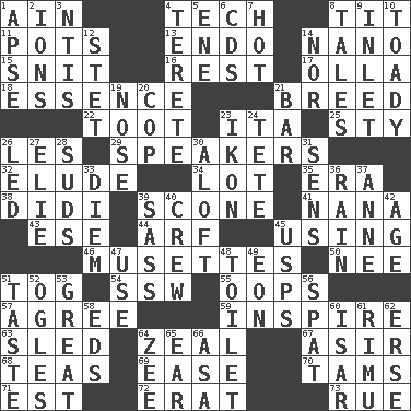 ACROSS 1. The 18th letter of the Arabic alphabet 4. Technical 8. Teat (slang) 11. Plant holders 13. Inside; within (prefix) 14. Billionth: prefix 15. In a ____ (agitated or irritated) 16. Remainder 17. Water jar 18. Center 21. A special lineage 22. A blast of a horn 23. Call ___ day 25. Filthy place 26. French article 29. Orators 32. Evade 34. Car dealer's back yard 35. Epoch 38. "You Light Up My Life" star Conn 39. Biscuitlike quick bread 41. Nanny 43. Compass dir. 44. Sandy's bark 45. Exploiting 46. French bagpipes 50. Born 51. Coat; cloak 54. Compass dir. 55. I made a mistake 57. Match 59. Motivate 63. Downhill vehicle 64. Ardor 67. SW Saudi Arabia district 68. Afternoon social gatherings 69. Comfort 70. Scottish caps 71. Eastern Standard Time (abbr.) 72. Part of Q.E.F. 73. Regret DOWN 1. Domed church section 2. Charged atoms 3. Nuclear Threat Initiatives 4. Cigar-shaped 5. Compass dir. 6. Music discs 7. Being at a high temperature 8. Stories 9. An arm off of a larger body of water 10. Sycophant 12. Proofreading order 14. Not either 19. Olfactory organ 20. Police officer (slang) 21. Oblong piece of solid material 23. Visual representation of an object 24. Wig 26. Directed 27. Writer Wiesel 28. Soap bubbles 30. Upward 31. Elected reps. 33. South Vietnam president (1954) 36. Water falling in drops from the sky 37. Singer Murray 39. Backtalk 40. Group working together 42. Mature 45. United States Postal Service (abbr.) 47. Purpose 48. Rest room 49. A really long time 51. Clothes sense 52. Stares 53. Relatively large 56. Petty quarrel 58. Begley and Asner 60. Austrian river, tributary to the Danube 61. Tall New Zealand timber tree 62. Celtic language 64. Last letter of the English alphabet 65. Ewer handle 66. White ___ sheet