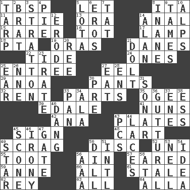 ACROSS 1. Cook's measure (abbr.) 5. Allow 8. Call ___ day 11. Nick name for Arthur 13. Mouth or opening 14. Of or related to the anus 15. More uncommon 16. Small child 17. Desk light 18. Parent Teacher Association (abbr.) 19. Mouths or openings 21. Natives or inhabitants of Denmark 22. Event that recurs at intervals 24. Singles 25. Main course 27. Snakelike fish 29. Small Philippine buffalo 30. Leg coverings 32. Monthly bill 33. Actors' quests 35. Double curve, resembling the letter S 39. Peak District village in England 41. Religious women 42. Santa ___, CA 43. Food holders 45. Signal 48. Heavy open wagon 49. Lean end of the neck 50. Flat circle 52. Single; one (prefix) 55. A blast of a horn 56. The 18th letter of the Arabic alphabet 57. Having ears or earlike features 59. Singer Murray 60. The first octave above the treble staff 61. Showing deterioration from age 62. Marina Del _, California 63. Everything 64. Silent film actress Nazimova DOWN 1. Canvas cover 2. Naughty child 3. Ski resort town in Vermont 4. Sliced dessert 5. Globular water bottle used in Asia 6. Greek god of love 7. Make lace 8. Empty; void 9. Corrects by punishment or discipline 10. High mountains 12. Wear away 14. ____ Jay Lerner 20. To sift 21. Stupid person 23. Feeling or showing extreme anger 25. Ewer handle 26. Compass dir. 27. Ingest 28. Followers of ems 30. Before (prefix) 31. Echolocation 33. Baking dish 34. Insect wing 36. From the throat 37. Compass dir. 38. Double-curved letter 40. Mild oath, euphamism for damn 43. Personal Computers (abbr.) 44. Shoestrings 45. Biscuitlike quick bread 46. Literary sarcasm 47. Yard entry 49. Play the lead 50. Deli pickle 51. International (abbr.) 53. 1994 drama film starring Jodie Foster 54. The main thing one is thinking about 56. Auto club (abbr.) 58. _ moment's notice (2 wds.)