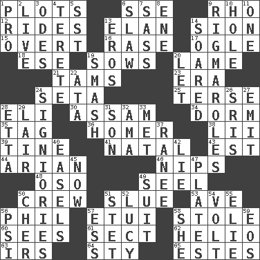 ACROSS 1. Schemes 6. Compass dir. 9. 17th letter of the Greek alphabet 12. Amusement-park features 13. Liveliness 14. The Jewish people; Israel 15. Unconcealed 16. To erase 17. Stare 18. Compass dir. 19. Sty mamas 20. Unable to walk 21. Scottish caps 23. Period 24. Stalk of a moss capsule 25. Laconic 28. Biblical high priest 30. Indian state 34. Dormintory (informal) 35. Label 36. Simpsons dad 38. Cards in a Roman deck? 39. Prong on a fork 41. Relating to or accompanying birth 43. Eastern Standard Time (abbr.) 44. Believer in; advocate of (suffix) 46. Pinches, bites 48. Bear (Spanish) 49. Stitch closed the eyes of (a falcon) 50. Group working together 51. Change direction abruptly 53. "___ Maria" 56. Silvers or Donahue 57. Needle holder 58. Took without asking 60. Observes 61. Religious group 62. Sun: prefix 63. Big collection agency 64. Filthy place 65. _____ Park, CO DOWN 1. Adept person 2. Moving, as bait 3. Lyric poems 4. Cigar-shaped 5. Fast jet (abbr.) 6. Cole _ (cabbage dish) 7. Backtalk 8. Compass dir. 9. Frustrating wastes of time 10. Opening into or through something 11. Single 13. Greek god of love 14. Flew 19. Box-office sellout 20. Allow 22. "One Day ___ Time" 24. Seigniories (variant) 26. Indian titles of respect 27. Give off 28. Singer James 29. Den 31. Manchild 32. Wet nurse (var.) 33. Was introduced to 37. The wife of a rajah (variant) 40. Artist's stands 42. Whopper 45. Immediately 47. Food holders 49. Set or collection 50. "Mermaids" star 51. Proofreading order 52. "I Love _" 54. Electrical Unit 55. Writer Wiesel 56. Air pressure measure (abbr.) 57. Curvy letter 58. A female animal or person 59. Greek goddess of the dawn