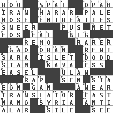 ACROSS 1. Friend of Pooh 4. Argument over a trivial matter 8. Brightly colored fish 12. SW Asia republic 14. Ethiopian city, capital of Harari 16. Diluted with white 17. Sense of smell 18. Pleas 20. Scornful expression 22. Suppuration 23. Fish or hair follower 24. Greek goddess of the dawn 25. Ingest 28. Massive 30. San ____ (Riviera town) 31. More valued for its uncommonness 35. E Mali city 37. Northwest Algerian city 40. Painter Guido (1575-1642) 41. "Two Mules for Sister ____" 42. Small island 44. Texas town _ City 45. Thailand, formerly 46. Polynesian shrub of the pepper family 47. Curvy letter 48. Artist's stand 50. ____ Bator 52. Reproach for some lapse or misdeed 54. Elected rep. 55. R.R. building 58. A really long time 61. Separate the seeds from cotton 63. Approach 65. Interpreter 70. 90 degrees 71. Billionth: prefix 72. Damascus' land 73. Against 74. Having or resembling wings 75. Filth; sediment 76. Observe DOWN 1. Wash lightly 2. U. of Maine site 3. Fertile tracts in a desert 4. A female animal or person 5. Baking dish 6. Nonscientific branch of learning 7. Canvas cover 8. Choose 9. Ache 10. Toward shelter 11. Behest 13. Born 15. Reuben's nickname 19. SW Saudi Arabia district 21. Portuguese money of account (variant) 26. Mine, in Marseilles 27. Cod relative 29. Place where plants grow 30. Nomad 32. Vintage cars 33. Conclusions 34. To free from 35. Greek goddess of the earth (variant) 36. Ancient river in northeast Turkey 38. In the manner of 39. Mole, birthmark 41. Compass dir. 43. Story 49. Straggles 51. Santa ___, CA 53. Friends 55. Actors Connery and Penn 56. Clothes sense 57. Nick name for Arthur 58. Inactive volcano in Sicily 59. Spoken 60. Grandmother 62. Negative votes 64. Teachers' org. 66. Or not 67. Three (prefix) 68. Lubricate 69. Actress Charlotte