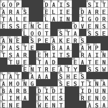 ACROSS 1. Republican Party 4. Raised platform 8. Be seated 11. Caspian sea tributary 13. Writer Wiesel 14. Have the gumption 15. Lie 16. (Had) reclined 17. Russian composer Stravinsky 18. Core 21. Baking chambers 22. Plunder 23. R.R. building 25. Compass dir. 26. A saturated hydrocarbon 29. Orators 32. Thick mixture 34. Sound made by sheep 35. Electrical Unit 38. Russian ruler of old 39. Gives off 41. Water falling in drops from the sky 43. Third day of the wk. 44. Small amount or degree 45. Consumed 46. Plea 50. Compass dir. 51. Make lace 54. Auto club (abbr.) 55. "______ My Girl" (Turtles hit) 57. Amid 59. French poetic form 63. Sharp remark 64. "You Light Up My Life" star Conn 67. Goddess of spring and wife of Bragi 68. Pale green bean 69. Makes supply last 70. Former U.S. Attorney General Janet 71. Compass dir. 72. Gone 73. White ___ sheet DOWN 1. Yard entry 2. Mouths or openings 3. Friends 4. Keyboard key 5. Chicken ___ king 6. One more than two 7. Elected rep. 8. Gurus 9. Removes the wrinkles 10. Laconic 12. Stitch closed the eyes of (a falcon) 14. HTML Container Element 19. Sense of smell 20. Police officer (slang) 21. Rowing implement 23. Three-handed card game 24. Beverages made from leaves 26. Fitting 27. Political cartoonist Thomas 28. He sold his birthright 30. Remain 31. "Two Mules for Sister ____" 33. Woody plant 36. Floor coverings 37. Sliced desserts 39. Singer James 40. Hindu Mythology: god of death 42. Compass dir. 45. Snake ____ (dice throw) 47. Tired old horse 48. Aid 49. Definite Article 51. Eating place 52. With great haste 53. Singer Mel 56. Use a swizzle stick 58. Basketball assoc. 60. The content of cognition 61. Religious women 62. Small Philippine buffalo 64. Morning condensation 65. D.D.E's nickname 66. Lair