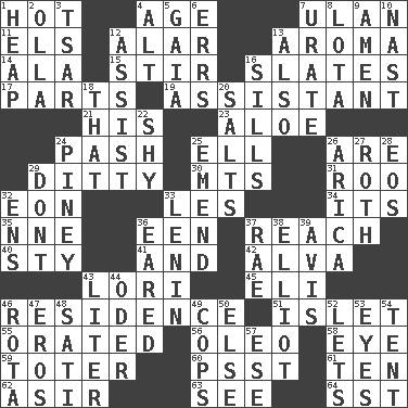 ACROSS 1. Being at a high temperature 4. Grow older 7. ____ Bator, Mongolia 11. Raised railways 12. Having or resembling wings 13. Odor 14. According to 15. Agitate 16. Chalkboards 17. Actors' quests 19. Aide 21. Part of HMS, perhaps 23. Medicinal plant 24. Romantic infatuation 25. Pipe bend 26. "We ___ not amused" (Victoria) 29. Short, simple song 30. Mountains (abbr.) 31. Friend of Pooh 32. Period of immesurable duration 33. French article 34. It is 35. Compass dir. 36. Car or cant ending 37. Arrive at 40. Filthy place 41. Added to 42. Inventor's middle name 43. Australian parrot (variant) 45. Connecticut Ivy Leaguer 46. Home 51. Small island 55. Spoke pompously 56. Margarine 58. Sight organ 59. Carrier 60. Inconspicuous attention getter 61. "___ Little Indians" 62. SW Saudi Arabia district 63. Perceive with the eye 64. Fast jet (abbr.) DOWN 1. Pile 2. Rounded earthenware pot or jar 3. Russian ruler of old 4. The first octave above the treble staff 5. Greek goddess of the earth (variant) 6. Blunders 7. A salt of uric acid 8. Globular water bottle used in Asia 9. So be it 10. Political cartoonist Thomas 12. Aid 13. In addition 16. Beverly of Met fame 18. Not this but _ 20. Table seasonings 22. Like a shrinking violet 24. Abounding in pines 25. Make improvements or corrections to 26. N. Chile seaport 27. Writer of Portnoy's Complaint (1969) 28. Greek goddess of the dawn 29. Do not 32. Followers of ems 33. Soviet premier 1918-24 36. Having ears or earlike features 37. Actress Charlotte 38. American author Paul (1891-1958) 39. Advice 43. 61 cubic inches 44. River in Europe 46. Roll call or roster of names 47. Greek god of love 48. Suttee (variant) 49. 911 reaches them 50. Otherwise 52. Allows 53. Snake ____ (dice throw) 54. Portable shelter 57. Compass dir.