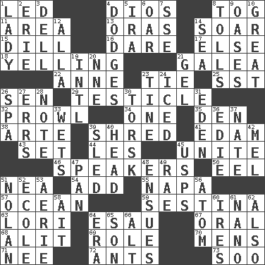 ACROSS 1. Directed 4. "Vaya con ____" 8. Coat; cloak 11. Length times width 13. Mouths or openings 14. Fly high 15. Deli pickle 16. Have the gumption 17. Otherwise 18. Crying or shouting loudly 21. An organ shaped like a helmet 22. Queen of England 1702-14 23. Make a knot 25. Fast jet (abbr.) 26. Elected rep. 29. A testis 32. Move like a hungry wolf 34. Single 35. Lair 38. Johnson of "Laugh-In" 39. Fragment 41. Dutch treat 43. Put into a specified state 44. French article 45. Join together 46. Orators 50. Snakelike fish 51. Teachers' org. 54. Find the sum of 55. California wine valley 57. Sea 59. French poetic form 63. Australian parrot (variant) 64. Son of Isaac 67. Of the mouth 68. Set down 69. Hero or heavy, e.g. 70. Not women's 71. Born 72. Pismires 73. "Barney Miller" actor Jack DOWN 1. Kenny Rogers chart-topper in '80 2. 4th largest of the Great Lakes 3. Small valley 4. Evades 5. Retirement account (abbr.) 6. Rowing implement 7. Compass dir. 8. For Whom the Bell _____ 9. Fertile tracts in a desert 10. Relatively large 12. Silent film actress Nazimova 14. Ocean 19. International (abbr.) 20. Compass dir. 21. Set 23. Prong on a fork 24. On the rocks 26. Health resort 27. Blunders 28. Observe 30. Cod relative 31. Genesis locale 33. Moistens 36. Singer Brickell 37. Nathan's nickname 39. Downhill vehicle 40. Froth on beer 42. Cartoonist voice _ Blanc 45. United States Postal Service (abbr.) 47. Baking dish 48. Follows as a consequence or result 49. Actress Charlotte 51. Pitcher Ryan 52. Learning spot: Fr. 53. Nest on high 56. Tiny particle 58. Small island 60. Angers 61. Billionth: prefix 62. In addition 64. Period 65. Boy, to dad 66. The first octave above the treble staff