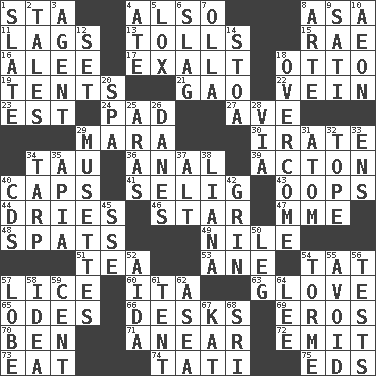 ACROSS 1. R.R. building 4. In addition 8. White ___ sheet 11. Straggles 13. For Whom the Bell _____ 15. Actress Charlotte 16. Toward shelter 17. Honor 18. Von Bismarck 19. Portable shelters 21. E Mali city 22. Distinctive style or manner 23. Eastern Standard Time (abbr.) 24. Writing tablet 27. "___ Maria" 29. Hindu Mythology: god of death 30. Feeling or showing extreme anger 34. The 19th letter of the Greek alphabet 36. Of or related to the anus 39. Gambison 40. Balmoral and tarboosh 41. Major League Baseball Commissioner Bud 43. I made a mistake 44. Frees from moisture 46. Play the lead 47. Madame (abbr.) 48. Arguments over trivial matters 49. The longest river in the world 51. Beverage made from leaves 53. One (Scot) 54. Make lace 57. Louse (plural) 60. Call ___ day 63. Michael Jackson trademark 65. Lyric poems 66. Writing tables 69. Greek god of love 70. Benjamin's nick name 71. Approach 72. Give off 73. Erode 74. Jacques of French films 75. Begley and Asner DOWN 1. Chalkboard 2. Lies 3. Rep 4. Had dinner 5. Brine-cured salmon 6. Volcanic refuse 7. Water jar 8. Johnson of "Laugh-In" 9. Suttee (variant) 10. Period of immesurable duration 12. Arrange properly for use 14. Portico 18. Conquer 20. Health resort 25. Ancient river in northeast Turkey 26. Natives or inhabitants of Denmark 28. By way of 29. French bagpipes 31. Tiny particle 32. Drink excessively 33. Followers of ems 34. Canvas cover 35. Capital of Western Samoa 37. Keyboard modifier key 38. Woody, climbing, usually tropical plant 40. Music discs 42. Amused look 45. Compass dir. 50. Part of a journey 52. Opera by Verdi 54. Singer Mel 55. Prevent the occurrence of 56. Trials 57. Ear part 58. The content of cognition 59. Penny 61. Portable shelter 62. At sea 64. Area sheltered from the wind 67. Krazy ___ of comics 68. _ Lanka
