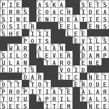 ACROSS 1. Sliced dessert 4. "____ silly question..." 8. Arranges properly for use 12. Blunders 14. Team commander 16. It may be bright or harebrained 17. Trig term 18. Pleas 20. Flexible twig of a willow tree 22. Snakelike fish 23. Followers of ems 24. A female animal or person 25. One more than two 28. Area sheltered from the wind 30. Plant holders 31. Vices 35. Armed conflict 37. ____ Jay Lerner 40. Roberta Peters solo 41. Grain storage tower 42. Prying instrument 44. Moist 45. ____ Bator 46. Edible starchy tuberous root 47. Compass dir. 48. Proofreads 50. State of nonexistence 52. Boat paddle 54. And so on (abbr.) 55. Fish or hair follower 58. Baseball player Mel 61. Small child 63. Eat (away) 65. Conciliate 70. Having or resembling wings 71. Ballerina skirt 72. Showery time 73. Friends 74. Perceives with the eye 75. A whole individual unit 76. Born DOWN 1. Mexican monetary units 2. From or relating to Ireland 3. Bert's buddy 4. Adept person 5. Boy, to dad 6. Krazy ___ of comics 7. Land measure 8. Be seated 9. Singer Brickell 10. Adolescent 11. Backtalk 13. Perceive with the eye 15. The bottom of a shoe or boot 19. Toward shelter 21. _ de Janeiro 26. Slanted text style (abbr.) 27. Small island 29. Eluded 30. Right away 32. SW Asia republic 33. Welles in "The Third Man" 34. Plant excrement 35. Uncontrolled 36. Mountain range southwest of Kyrgyzstan 38. Actress Gardner 39. Impudent aggressiveness 41. Take to court 43. Carrot, for example 49. Suttee (variant) 51. Frozen water 53. Round or rotation of duties 55. Pitcher Ryan 56. Peak District village in England 57. Laconic 58. Chooses 59. Loyal 60. Haul 62. Native american tent (variation) 64. Reproach for some lapse or misdeed 66. Ichor 67. Tate display 68. Make a knot 69. Shade tree