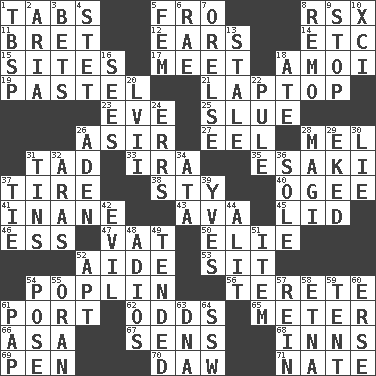 ACROSS 1. Bar bills 5. Back 8. Acura sports coupe 11. Cy Young winner Saberhagen 12. Hearing organs 14. And so on (abbr.) 15. Settings 17. Rendezvous 18. Mine, in Marseilles 19. Soft color 21. Portable computer 23. First lady 25. Turn sharply 26. SW Saudi Arabia district 27. Snakelike fish 28. Cartoonist voice _ Blanc 31. Small boy 33. Retirement account (abbr.) 35. 1973 Nobel Price Winner (Physics) Leo 37. Become fatigued 38. Filthy place 40. Double curve, resembling the letter S 41. Lacking in sense or substance 43. Actress Gardner 45. Hat (slang) 46. Double-curved letter 47. Large container 50. Writer Wiesel 52. Helper 53. Be seated 54. Cotton for raincoats, e.g. 56. Cylindrical with tapered ends 61. Sweet dark-red dessert wine 62. Probability 65. Distance measurement 66. White ___ sheet 67. Elected reps. 68. Taverns 69. Fenced enclosure 70. Simpleton 71. Nathan's nickname DOWN 1. Cook's measure (abbr.) 2. Roberta Peters solo 3. Antes 4. Proofreading order 5. Opposite of masc. 6. Actress Charlotte 7. Threatening words 8. San ____ (Riviera town) 9. Constrict 10. One more than ninety 13. Showing deterioration from age 16. Perceives with the eye 18. Had dinner 20. 57 in ancient Rome 22. Whimper 24. Blunders 26. Arabian gulf 28. Wise men 29. Supplemented with great effort 30. Untruth 31. Canisters 32. Caspian sea tributary 34. "One Day ___ Time" 36. Not divided or shared with others 37. Neckwear 39. Jacques Cousteau's middle name 42. Tending to cause great harm 44. Came down and settled, as after flight 48. Goodbye (Sp.) 49. Watched over 51. A whole individual unit 52. Fitting 54. Introduce or present, as a question 55. NW Algerian seaport 57. It's straight from the horse's mouth 58. Inactive volcano in Sicily 59. Portable shelter 60. Celtic language 61. Infant food 63. Heredity factor (abbr.) 64. Compass dir.