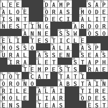 ACROSS 1. Area sheltered from the wind 4. Moist 8. Plant excrement 11. Medicinal plant 13. Mouths or openings 14. Method 15. Is not 16. Tenth: prefix 17. Set down 18. Nestling 21. Zeal 22. Queen of England 1702-14 23. Compass dir. 25. Bear (Spanish) 26. Connecticut Ivy Leaguer 29. A testis 32. With motion or animation 34. Insect wing 35. Cleo's killer 38. Mountain range 39. NE Netherlands city 41. Oceans 43. Lyricist Gershwin 44. Allow 45. Staphylococcus 46. Storms 50. Actress Charlotte 51. Small child 54. Feline 55. Jacques of French films 57. U. of Maine site 59. Choose not to consume 63. Cause heat under the collar 64. Jai _ 67. Hoop that covers a wheel 68. Undercover agent 69. One who doesn't tell the truth 70. Lyric poems 71. Followers of ems 72. Afternoon social gatherings 73. Eastern Standard Time (abbr.) DOWN 1. (Had) reclined 2. Otherwise 3. Immeasurably long periods of time 4. Evades 5. "We ___ not amused" (Victoria) 6. Apple computer (short form) 7. 23rd letter of the Greek alphabet 8. Twentieth part of a lira 9. Goodbye (Sp.) 10. Stone: prefix 12. Singer James 14. Make imperfect 19. To the inside or interior of 20. Compass dir. 21. Leather borer 23. Filth; sediment 24. Glance over 26. Australian flightless bird 27. Australian parrot (variant) 28. Austrian river, tributary to the Danube 30. Clothes sense 31. Compass direction 33. Narrow board 36. Scorch 37. Dad 39. _ mater 40. Back-to-school mo. 42. A female animal or person 45. Fast planes 47. Environmental prefix 48. Flight of steps 49. Keyboard key 51. Singer Mel 52. Constellation of myth 53. For Whom the Bell _____ 56. "Tell ____ the Marines!" 58. Born 60. Assistant 61. Angers 62. Egg locale 64. Keyboard modifier key 65. Falsehood 66. American Automobile Association (abbr.)