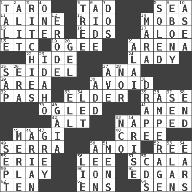 ACROSS 1. Pacific island yam 5. Small amount or degree 8. Ocean 11. Place in a line 13. River (Sp.) 14. Disorderly crowds 15. 61 cubic inches 16. Begley and Asner 17. Medicinal plant 18. And so on (abbr.) 19. Double curve, resembling the letter S 21. Sports stadium 22. Flintstone garb 24. Kenny Rogers chart-topper in '80 25. A glass for beer 27. Santa ___, CA 29. Type of rug 30. Shun 32. Romantic infatuation 33. A person who is older than you are 35. To erase 39. Stared at amorously 41. So be it 42. The first octave above the treble staff 43. Slept 45. Wise men 48. Algonquian 49. Father Junipero _ 50. Mine, in Marseilles 52. To separate or throw off 55. One of the Great Lakes 56. Area sheltered from the wind 57. Any of the three canals of the cochlea 59. Shaw product 60. Electrically charged atom 61. _ Allan Poe 62. Nine, plus one 63. Followers of ems 64. Elected reps. DOWN 1. Lie 2. Came down and settled, as after flight 3. Actors Guy, Robert Welles, and Clint 4. Single 5. Family _ (genealogy) 6. Helper 7. Two (Sp.) 8. Having a sole or soles 9. Black 10. Toward the sea 12. Wear away 14. Hindu Mythology: god of death 20. Set 21. Mountain range southwest of Kyrgyzstan 23. Potato state 25. Plant excrement 26. Epoch 27. "___ Maria" 28. Not either 30. Find the sum of 31. Window treatment 33. Pipe bend 34. Allow 36. Electrical Measurement 37. Observe 38. Conclusion 40. Greek goddess of the earth (variant) 43. Non-commissioned officer (abbr.) 44. Originate 45. Haggard of country music 46. Believer in; advocate of (suffix) 47. Jennifer or Joel 49. Back-to-school mo. 50. Age 51. Not women's 53. Style 54. Hearing organs 56. Whopper 58. Music discs