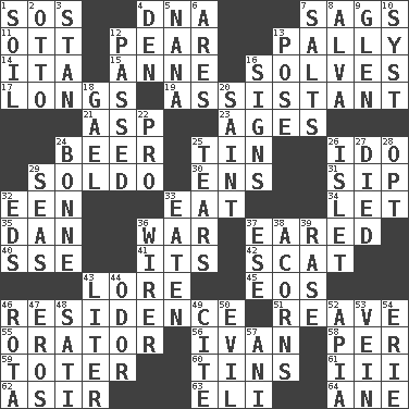 ACROSS 1. Mayday 4. Heredity factor (abbr.) 7. Droops 11. Baseball player Mel 12. Lightbulb-shaped fruit 13. Chummy 14. Call ___ day 15. Singer Murray 16. Finds the solution 17. Yearns 19. Aide 21. Cleo's killer 23. Ripens 24. Fermented drink made from hops 25. Metal container 26. Wedding promise 29. Twentieth part of a lira 30. Followers of ems 31. Small drink 32. Car or cant ending 33. Ingest 34. Allow 35. One of the 12 tribes of Israel 36. Armed conflict 37. Having ears or earlike features 40. Compass dir. 41. ___ a Wonderful Life 42. Scram! 43. Old wives' tales, e.g. 45. Greek goddess of the dawn 46. Dwelling 51. Rob, plunder, or pillage 55. Speaker 56. "Terrible" tsar 58. For each 59. Carrier 60. Canisters 61. One more than two 62. SW Saudi Arabia district 63. Biblical high priest 64. One (Scot) DOWN 1. Earth 2. Von Bismarck 3. Comedian Laurel of Laurel & Hardy 4. Lair 5. Nanny 6. Ancient Greek god of war 7. Table seasonings 8. Inventor's middle name 9. Small, secluded valley 10. System (abbr.) 12. Went by 13. Introduce or present, as a question 16. Attaches a signature 18. Highlander 20. Inhabitant of Heaven 22. Adept person 24. Maid-servant 25. Rends 26. Small island 27. Passed on 28. Elect 29. Oceans 32. Begley and Asner 33. Consumed 36. One who wires 37. Compass dir. 38. Oak nuts 39. To erase 43. 61 cubic inches 44. Aroma 46. Round or rotation of duties 47. Greek god of love 48. Suttee (variant) 49. Quote 50. Tending to cause great harm 52. Capital of Western Samoa 53. Distinctive style or manner 54. One of the Great Lakes 57. Black tropical American cuckoo