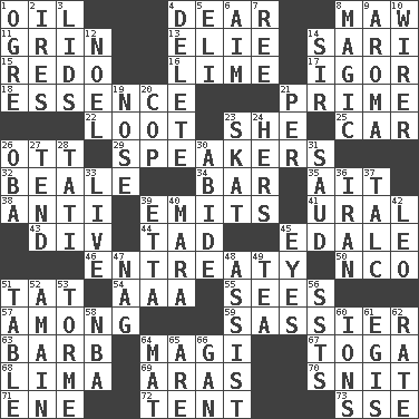 ACROSS 1. Lubricate 4. Letter starter 8. Opening into something insatiable 11. Amused look 13. Writer Wiesel 14. Indian skirt 15. Redecorate 16. Welles in "The Third Man" 17. Russian composer Stravinsky 18. Center 21. First class 22. Plunder 23. A female animal or person 25. Automobile 26. Baseball player Mel 29. Orators 32. Calif. Air Force Base 34. Oblong piece of solid material 35. Small island 38. Against 39. Gives off 41. Mountain range 43. HTML Container Element 44. Bit 45. Peak District village in England 46. Plea 50. Non-commissioned officer (abbr.) 51. Make lace 54. Auto club (abbr.) 55. Perceives with the eye 57. Amid 59. More lively and spirited 63. Sharp remark 64. Wise men 67. Ancient Roman robe 68. Pale green bean 69. Ancient river in northeast Turkey 70. In a ____ (agitated or irritated) 71. Compass dir. 72. Portable shelter 73. Compass dir. DOWN 1. Legendary monster 2. Angers 3. Hats (slang) 4. Erase 5. Connecticut Ivy Leaguer 6. Direct toward a target or goal 7. To sift 8. Mysterious quality of enchantment 9. Odor 10. One who wires 12. Christmas carol 14. Title for a knight 19. Sense of smell 20. Police officer (slang) 21. For each 23. Three-handed card game 24. Possessive pronoun 26. Chief or king in Benin or Nigeria 27. Watch over 28. Jacques of French films 30. Remain 31. Saudi Arabian king (1953-1964) 33. Moving, as bait 36. SW Asia republic 37. Baby powder 39. Singer James 40. Hindu Mythology: god of death 42. Lion 45. Snake ____ (dice throw) 47. Tired old horse 48. Help 49. Afternoon social gathering 51. Eating place 52. At full speed 53. Singer Mel 56. Fast planes 58. Basketball assoc. 60. Charged particles 61. Armor plate that protects the chest 62. Pace 64. Floor covering 65. "We ___ not amused" (Victoria) 66. Separate the seeds from cotton