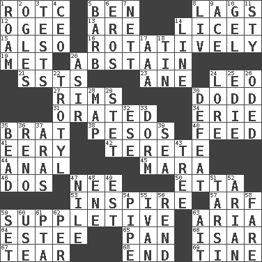 ACROSS 1. College mil. group 5. Benjamin's nick name 8. Falls behind 12. Double curve, resembling the letter S 13. "We ___ not amused" (Victoria) 14. It is permitted: Lat. 15. In addition 16. Rotating or pertaining to rotation 19. Was introduced to 20. Choose not to consume 21. Fast planes 23. One (Scot) 24. Lion 27. Basketball hoops 30. Texas town _ City 31. Spoke pompously 34. 4th largest of the Great Lakes 35. Naughty child 38. Mexican monetary units 40. Nourish 41. Suggestive of the supernatural 42. Cylindrical with tapered ends 44. Of or related to the anus 45. Hindu Mythology: god of death 46. Two (Sp.) 47. Born 50. Singer James 53. Stimulate to action 57. Sandy's bark 59. Supplying deficiencies 63. Roberta Peters solo 64. First name in cosmetics 65. Baking dish 66. Austrian river, tributary to the Danube 67. Lacerate 68. Conclusion 69. Prong on a fork DOWN 1. Wander 2. Stares 3. Trials 4. Corporate head (abbr.) 5. Sharp remark 6. Greek god of love 7. Remaining after all deductions 8. 54 in ancient Rome 9. Adept person 10. Set 11. Filthy place 14. Actor's bit 17. American Automobile Association (abbr.) 18. Metal container 20. SW Saudi Arabia district 22. TNT 24. Old wives' tales, e.g. 25. Singer Brickell 26. Wrote a lyric poem 28. Atlas unit 29. Proofreading order 30. Outscore 32. Compass dir. 33. Dormintory (informal) 35. Necklace unit 36. Western Nevada city 37. Caspian sea tributary 39. Ocean 43. Woody plant 47. "Death on the ____" 48. Compass dir. 49. Eastern Standard Time (abbr.) 51. Tarsus (plural) 52. Believer in; advocate of (suffix) 54. Corncob 55. "Terrible" tsar 56. Tear apart 58. Conductor's collection 59. Arrange properly for use 60. Purpose 61. Parent Teacher Association (abbr.) 62. For each 63. Small island