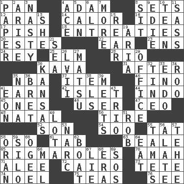 ACROSS 1. Baking dish 4. First of billions? 8. Puts into a specified state 12. Caspian sea tributary 14. Bodily heat indicating an inflammation 16. The content of cognition 17. Expression of disdain 18. Pleas 20. _____ Park, CO 22. Ewer handle 23. Followers of ems 24. Marina Del _, California 25. Shade tree 28. _ de Janeiro 30. Polynesian shrub of the pepper family 31. Following 35. Basketball assoc. 37. Detail 40. Fine (Spanish) 41. Merit 42. Small island 44. Southeast Asian peninsula 45. Washington bills 46. One who makes use of a thing 47. Corporate head (abbr.) 48. Brizilian seaport 50. Hoop that covers a wheel 52. Male offspring 54. "Barney Miller" actor Jack 55. Make lace 58. Bear (Spanish) 61. Bar bill 63. Memphis, Tenn. Street 65. Frustrating wastes of time 70. Housemaid 71. Toward shelter 72. Capital of Egypt 73. Wig 74. Christmas carol 75. Afternoon social gatherings 76. Observe DOWN 1. Some stationery 2. Get up 3. Characterized by obscenity 4. Adept person 5. One of the 12 tribes of Israel 6. Keyboard modifier key 7. Greater amount 8. Be seated 9. Singer Brickell 10. Adolescent 11. Backtalk 13. A female animal or person 15. Bring up, as a child 19. Roberta Peters solo 21. Ocean 26. 57 in ancient Rome 27. Taiwanese island in East China Sea 29. Position of authority 30. Sunflower state 32. Prong on a fork 33. Inside; within (prefix) 34. Friend of Pooh 35. Grandmother 36. Cy Young winner Saberhagen 38. Raised railways 39. Confronts 41. Period of immesurable duration 43. Musical group of three 49. Globular water bottle used in Asia 51. Director Reiner 53. Drug cop 55. Corrects by punishment or discipline 56. Having winglike extensions 57. Giggle 58. Northwest Algerian city 59. Grain storage tower 60. Double curve, resembling the letter S 62. Water vessel 64. Consume 66. Cartoonist voice _ Blanc 67. Falsehood 68. Epoch 69. Mayday