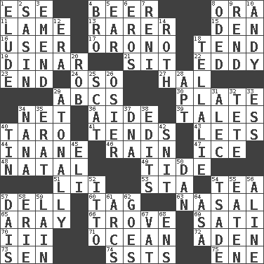 ACROSS 1. Compass dir. 4. Fermented drink made from hops 8. Mouth or opening 11. Unable to walk 13. More uncommon 15. Lair 16. One who makes use of a thing 17. U. of Maine site 18. Be inclined (to) 19. Middle Eastern gold or silver currency 21. Be seated 22. Whirlpool 23. Conclusion 24. Bear (Spanish) 27. Actor Linden 29. Lettered men learn these first 30. Food holder 34. Fish or hair follower 36. Helper 39. Falsehoods 40. Edible starchy tuberous root 41. Is inclined (to) 43. Allows 44. Lacking in sense or substance 46. Water falling in drops from the sky 47. Frozen water 48. Brizilian seaport 49. Event that recurs at intervals 51. Cards in a Roman deck? 53. R.R. building 54. Beverage made from leaves 57. Small valley 60. Label 63. Rhinal 65. Like ___ of sunshine 66. Collection of objects 69. Suttee (variant) 70. One more than two 71. Sea 72. Arabian gulf 73. Elected rep. 74. Fast planes 75. Compass dir. DOWN 1. Dodge 2. Indian antelope 3. Make improvements or corrections to 4. Sis' sibling 5. Hearing organ 6. Greek god of love 7. Painter Guido (1575-1642) 8. Wrote a lyric poem 9. Tear apart 10. Actor Griffith 12. Epoch 14. Writer of Portnoy's Complaint (1969) 18. Copy Pinocchio 20. Director Reiner 25. Get outta here! 26. Flexible twig of a willow tree 28. Fitting 29. Lacking a tonal center or key 31. Actor Baldwin 32. Wig 33. Double-curved letter 34. Grandmother 35. Part of Q.E.F. 37. Heredity factor (abbr.) 38. Proofreads 40. Shallow baking pan 42. In a ____ (agitated or irritated) 45. Biblical high priest 50. Daniel's nick name 52. "Tell ____ the Marines!" 54. Sadhe (variant) 55. Consumed 56. Place in a line 57. Raised platform 58. 4th largest of the Great Lakes 59. (Had) reclined 61. Curves 62. Moves 64. White ___ sheet 67. Large container 68. Followers of ems