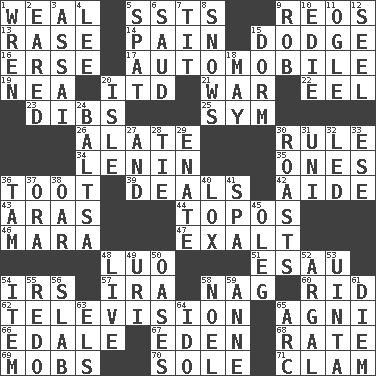 ACROSS 1. Welt 5. Fast planes 9. Vintage cars 13. Raze (variant) 14. Ache 15. Evade 16. Celtic language 17. Form of transportation 19. Teachers' org. 20. It would 21. Armed conflict 22. Snakelike fish 23. Claim 25. Symbol (abbr.) 26. Having winglike extensions 30. General guideline 34. Soviet premier 1918-24 35. Washington bills 36. A blast of a horn 39. Allots cards 42. Assistant 43. Caspian sea tributary 44. Literary convention 46. Hindu Mythology: god of death 47. Honor 48. Nilotic language 51. He sold his birthright 54. Big collection agency 57. Retirement account (abbr.) 58. Tired old horse 60. To free from 62. Boob tube 65. Hindu god of fire 66. Peak District village in England 67. Genesis locale 68. Pace 69. Disorderly crowds 70. Flatfish 71. Dollar (slang) DOWN 1. Songbird 2. Having ears or earlike features 3. Slender Brazilian palm 4. Area sheltered from the wind 5. Petty quarrel 6. Saudi Arabian king (1953-1964) 7. Teat (slang) 8. Frozen precipitation (plural) 9. Director Reiner 10. Singer Brickell 11. Stare at amorously 12. Stitch closed the eyes of (a falcon) 15. Dormintory (informal) 18. Fifth month 20. Small island 24. Greek mezzo-soprano Agnes 27. Plus 28. Neckwear 29. Maternal 30. Exposes to great heat 31. Corn or form start 32. Directed 33. Compass dir. 36. Scottish cap 37. Mouth or opening 38. Rowing implement 40. Brine-cured salmon 41. Health resort 45. Cassini of fashion 48. Not recorded 49. RI univ. 50. Fertile tracts in a desert 52. Therefore, facetiously 53. National forest in Provo, Utah 54. A whole individual unit 55. Make new 56. Broad, flat, thick piece 58. Christmas carol 59. Queen of England 1702-14 61. South Vietnam president (1954) 63. Raised railways 64. Wedding promise 65. Curve