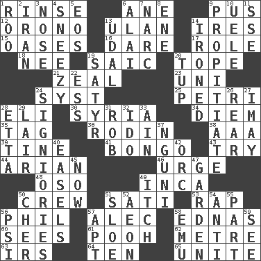 ACROSS 1. Remove soap 6. A saturated hydrocarbon 9. Festering 12. U. of Maine site 13. Uhlan (variant) 14. Angers 15. Fertile tracts in a desert 16. Have the gumption 17. Hero or heavy, e.g. 18. Born 19. Ketch in the Levant 20. Drink excessively 21. Ardor 23. University (slang) 24. System (abbr.) 25. _ dish (used to culture cells) 28. Connecticut Ivy Leaguer 30. Damascus' land 34. South Vietnam president (1954) 35. Label 36. "The Thinker" sculptor 38. Auto club (abbr.) 39. Prong on a fork 41. Beat drum 43. Attempt to accomplish something 44. Believer in; advocate of (suffix) 46. Goad 48. Bear (Spanish) 49. South American Indian 50. Ship's personnel 51. Suttee (variant) 53. Strike 56. Silvers or Donahue 57. Actor Baldwin 58. Ferber et al. 60. Perceives with the eye 61. "Silly old bear" 62. Distance measurement (Brit.) 63. Big collection agency 64. Nine, plus one 65. Join together DOWN 1. Friend of Pooh 2. SW Asia republic 3. Sense of smell 4. Dwarf with a sinus problem 5. Greek goddess of the dawn 6. Jai _ 7. Drug cop 8. Compass dir. 9. Appease 10. Ubangi River tributary 11. Compass dir. 13. Allodial 14. Pressed 19. Letch 20. Uncastrated adult male sheep 22. Double-curved letter 24. Seigniories (variant) 26. Located in or toward the back 27. "If ____ say so..." 28. Singer James 29. Den 31. Director Reiner 32. Wedding promise 33. The 18th letter of the Arabic alphabet 37. Group of southern Bantu languages 40. Artist's stands 42. The grampus (Milton) 45. Immediately 47. Place where plants grow 49. Hankering 50. "Mermaids" star 51. A type of plum 52. Age 54. Opposed to 55. Component 56. Air pressure measure (abbr.) 57. Fitting 58. Australian flightless bird 59. Observe