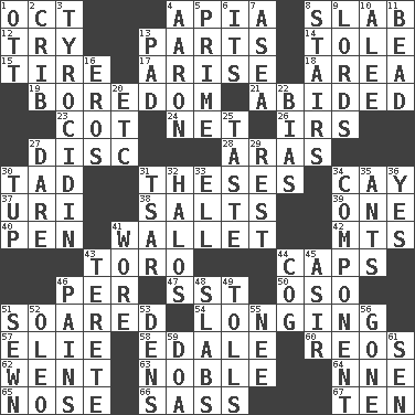 ACROSS 1. Sep. follower 4. Capital of Western Samoa 8. Broad, flat, thick piece 12. Attempt to accomplish something 13. Components 14. Lacquered or enameled metalware 15. Become fatigued 17. Originate 18. Type of rug 19. Mood resulting from idleness 21. Stayed 23. Small bed 24. Fish or hair follower 26. Big collection agency 27. Plate 28. Caspian sea tributary 30. Small boy 31. College papers 34. Island 37. RI univ. 38. Table seasonings 39. Single 40. Writing instrument 41. Place for singles 42. Mountains (abbr.) 43. "Corrida" creature 44. Balmoral and tarboosh 46. For each 47. Fast jet (abbr.) 50. Bear (Spanish) 51. Flew 54. Yearning 57. Writer Wiesel 58. Peak District village in England 60. Vintage cars 62. Left 63. Having high moral qualities 64. Compass dir. 65. Olfactory organ 66. Backtalk 67. Nine, plus one DOWN 1. Baseball player Mel 2. Baby bed with high sides 3. Polypeptide antibiotic 4. Composer Copland 5. A-one 6. It is 7. At sea 8. Flight of steps 9. Domineers 10. Toward shelter 11. Necklace unit 13. Writing tablet 16. Greek god of love 20. And so on (abbr.) 22. Prejudice 25. Clothes sense 27. Have the gumption 29. Relief 30. Uncastrated adult male sheep 31. Russian ruler of old 32. Saint headwear 33. Pipe bend 34. Piece 35. Pismires 36. Consenting reply 41. Had on 43. Cylindrical with tapered ends 44. Gear tooth 45. SW Saudi Arabia district 46. Aches 48. Broad, flat, thick pieces 49. For Whom the Bell _____ 51. Stitched 52. Margarine 53. Lairs 55. Born 56. Went 59. ___ good deed 61. Elected rep.